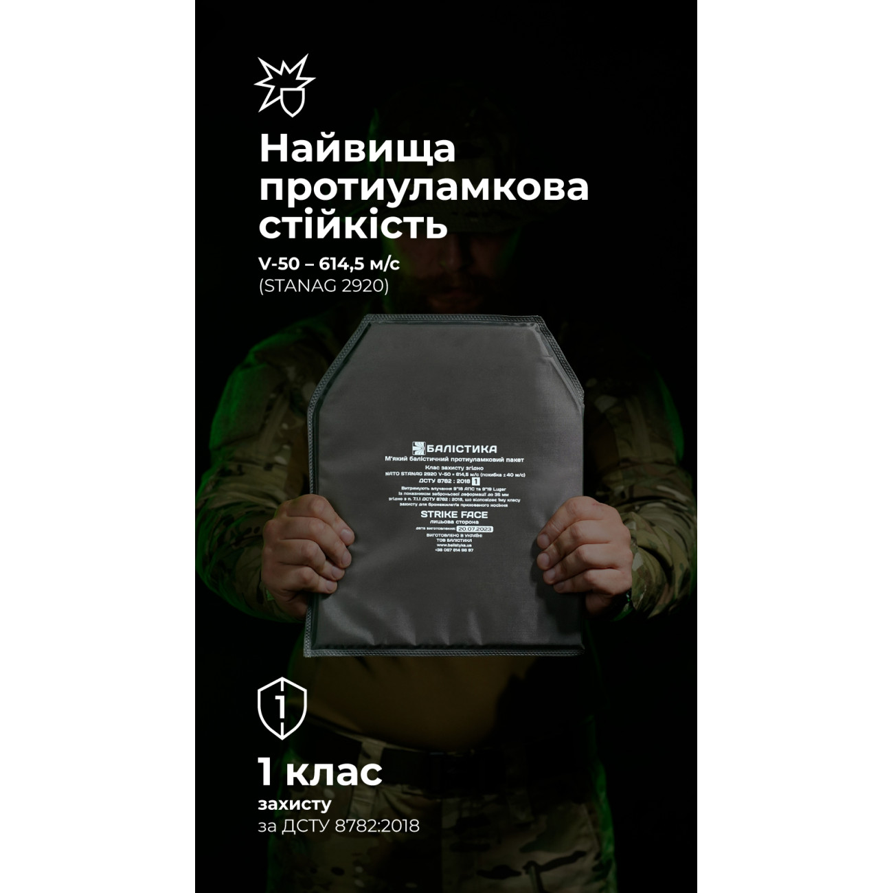Наші бронепакети створено насамперед для захисту від уламків, які є найпоширенішою загрозою на фронті. Вироби мають найвищі показники протиуламкової стійкості та результати за показником V50 (STANAG 2920, ДСТУ 8782:2018) у своєму класі. Надвисокомолекулярний поліетилен (НВМПЕ), з якого вони виготовлені, є легким, гнучким і водночас дуже міцним матеріалом.