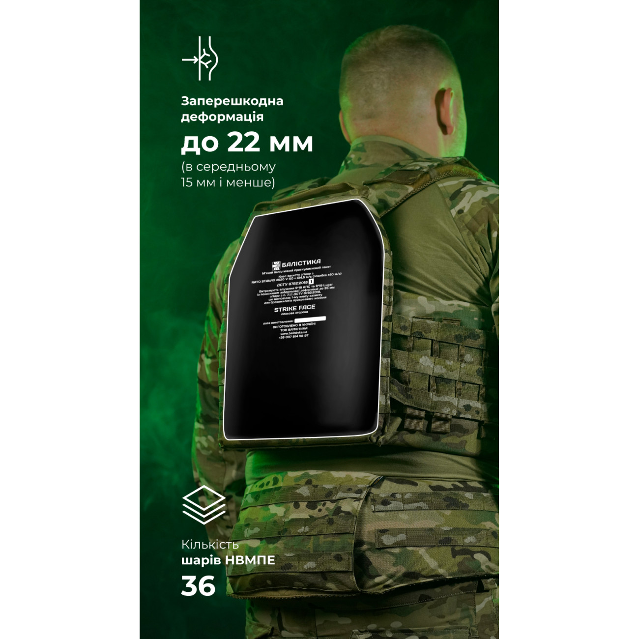 М’який балістичний підпір з НВМПЕ призначений для захисту тіла від уламків бронеплити у разі її пробиття. Також зменшує заперешкодну травму у ситуації, коли плита не пробита.