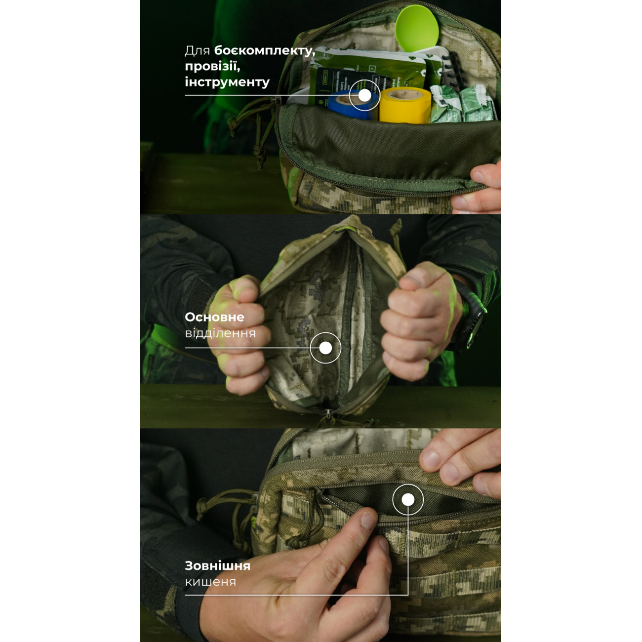 Місткий і витривалий підсумок підходить для організованого зберігання дрібного спорядження, інвентарю, боєприпасів, провізії