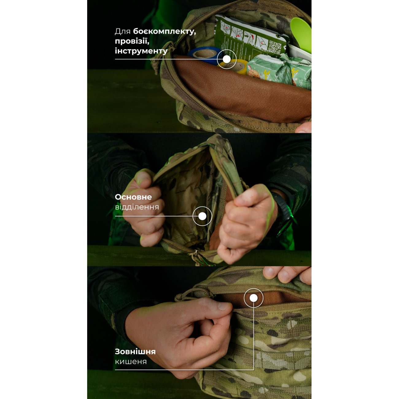 Місткий і витривалий підсумок підходить для організованого зберігання дрібного спорядження, інвентарю, боєприпасів, провізії