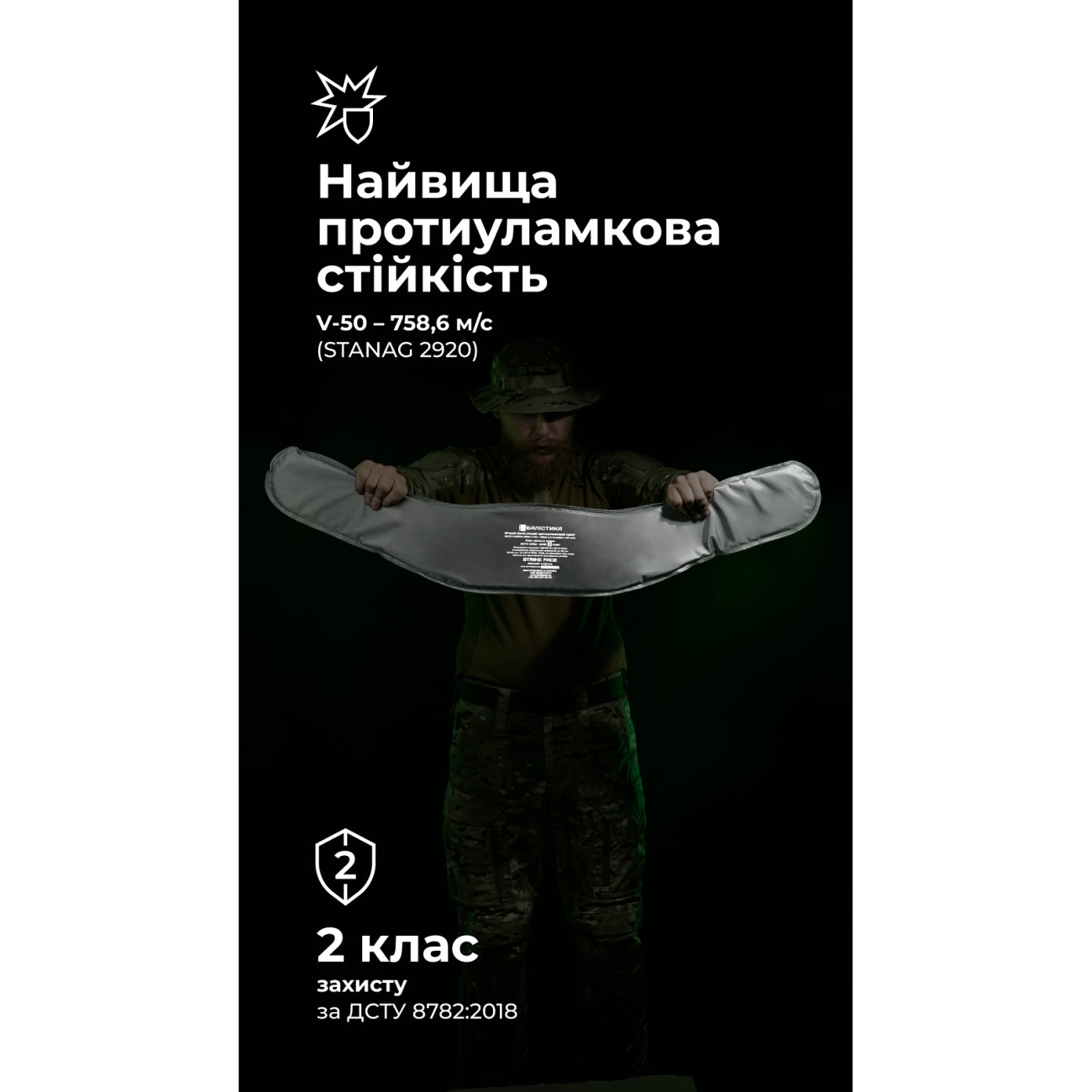 Наші бронепакети створено насамперед для захисту від уламків, які є найпоширенішою загрозою на фронті. Вироби мають найвищі показники протиуламкової стійкості та результати за показником V50 (STANAG 2920, ДСТУ 8782:2018) у своєму класі. Надвисокомолекулярний поліетилен (НВМПЕ), з якого вони виготовлені, є легким і водночас дуже міцним матеріалом.