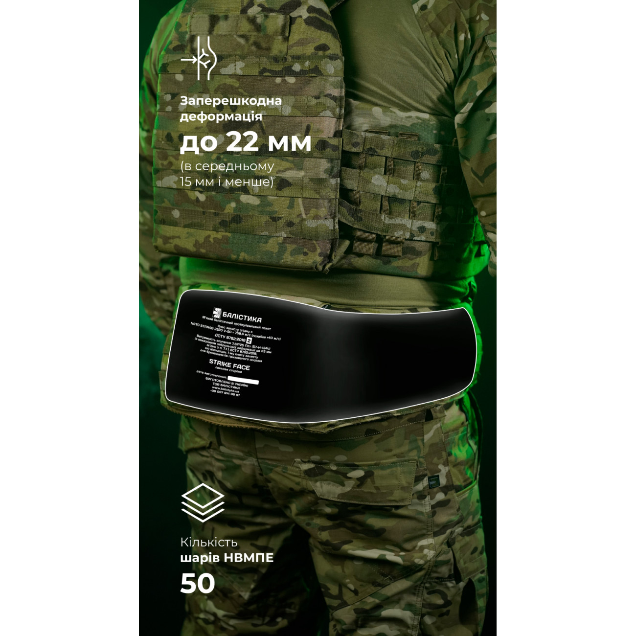 🔹 Має заперешкодну деформацію до 22 мм (у середньому 15 мм і менше). Цьому сприяє щільне плетіння волокон НВМПЕ. Це критично важливо для зменшення ризику контузій без пробиття.