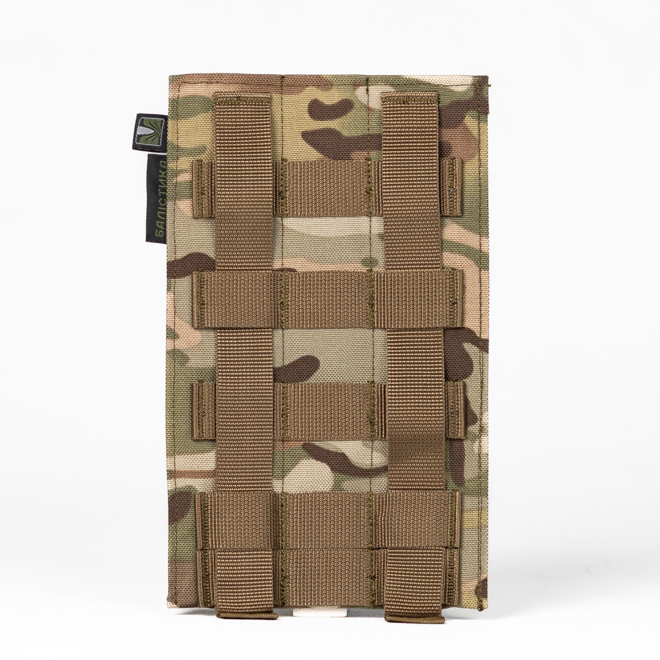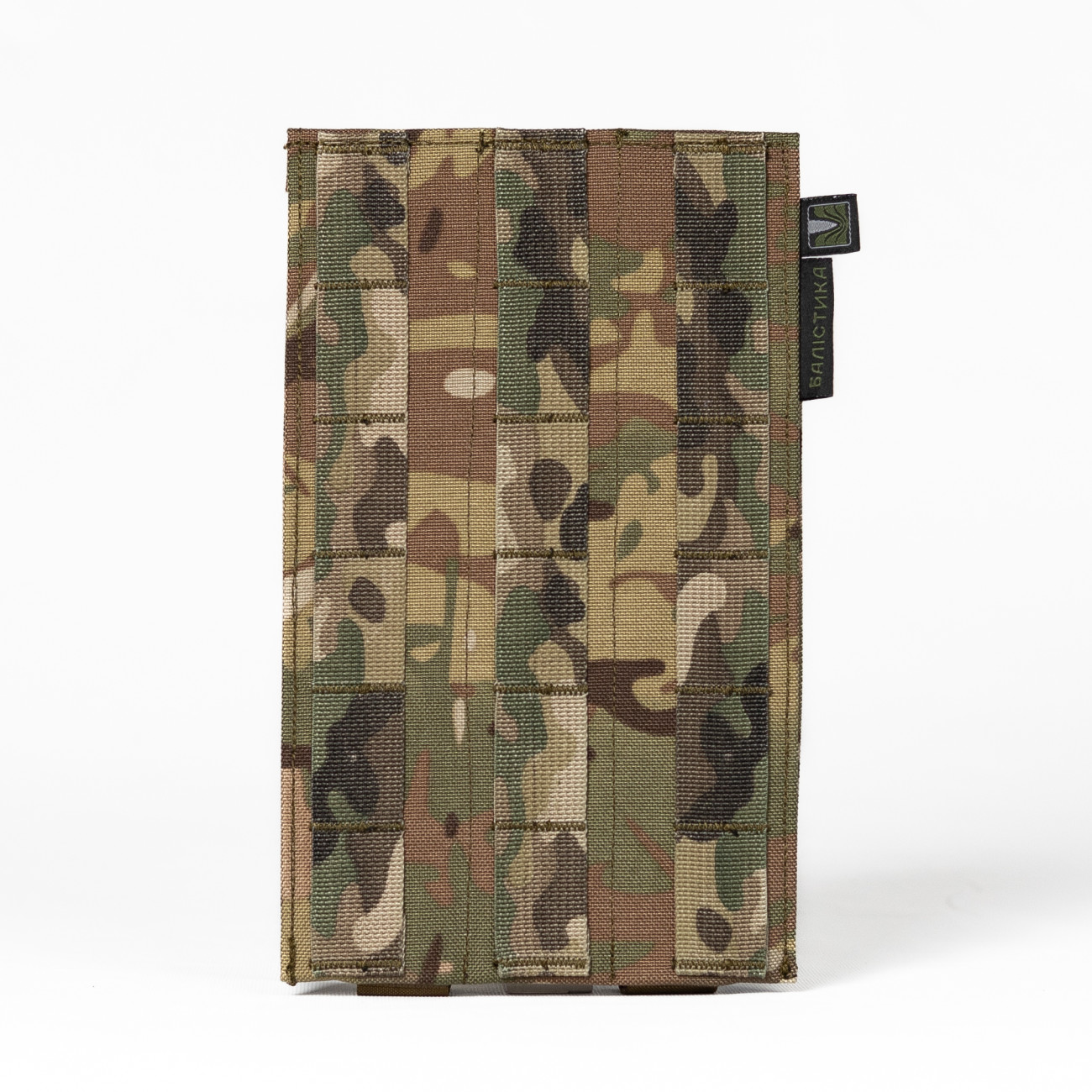 - Спереду вміщені три ряди чарунок MOLLE по шість у кожному, яких вистачає для шнурування трьох підсумків «Колчан».