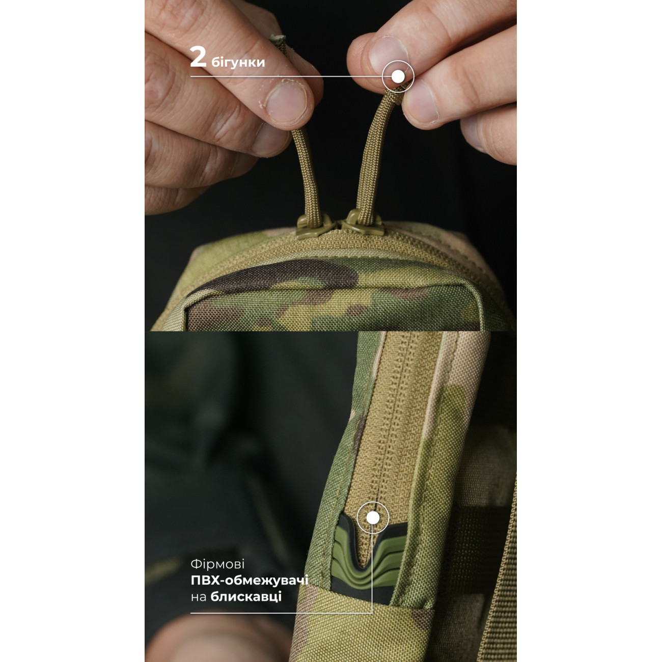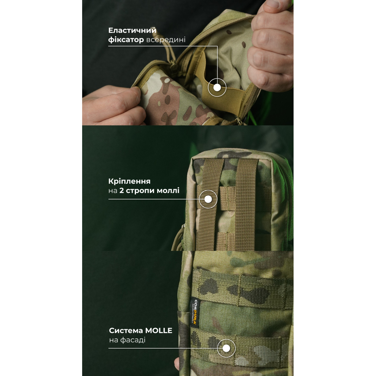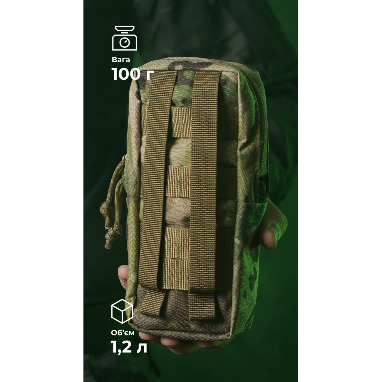 🔹 Кріпиться до спорядження на 2 стропи моллі, займає ширину у 3 чарунки.