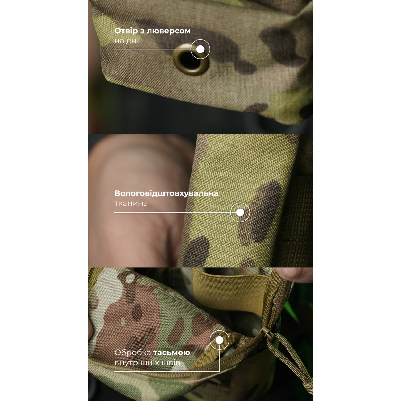 - Міцні матеріали: нейлон 500D (аналог Cordura), Oxford 340D