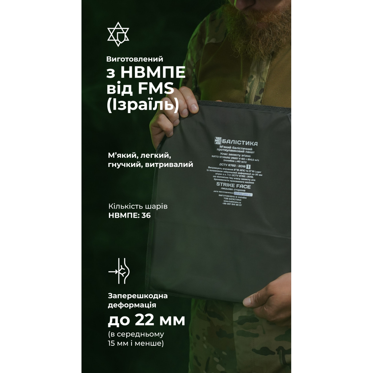 Наші бронепакети створено насамперед для захисту від уламків, які є найпоширенішою загрозою на фронті. Вироби мають найвищі показники протиуламкової стійкості та результати за показником V50 (STANAG 2920, ДСТУ 8782:2018) у своєму класі. Надвисокомолекулярний поліетилен (НВМПЕ), з якого вони виготовлені, є легким, гнучким і водночас дуже міцним матеріалом.