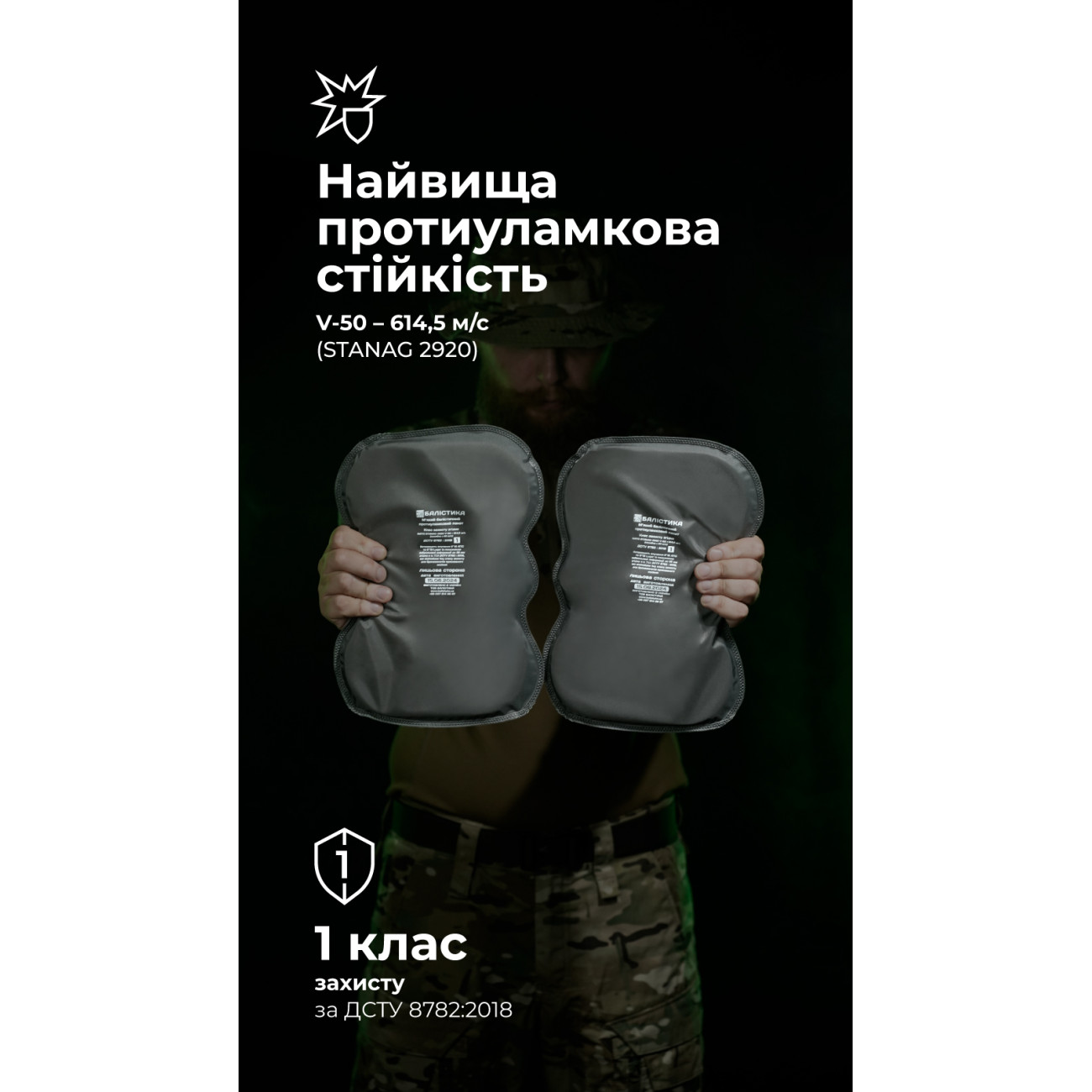 Наші бронепакети створено насамперед для захисту від уламків, які є найпоширенішою загрозою на фронті. Вироби мають найвищі показники протиуламкової стійкості та результати за показником V50 (STANAG 2920, ДСТУ 8782:2018) у своєму класі. Надвисокомолекулярний поліетилен (НВМПЕ), з якого вони виготовлені, є легким, гнучким і водночас дуже міцним матеріалом.