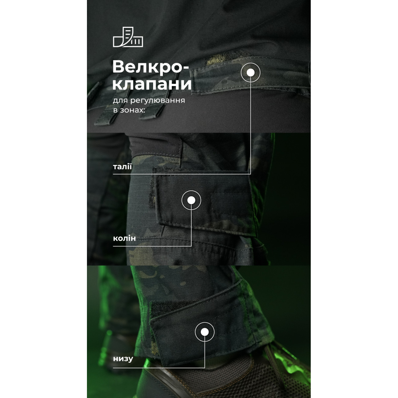 - Виготовлені з витривалих матеріалів: ріп-стоп NYCO, Flex 4 Way Stretch, Cordura 1000D
