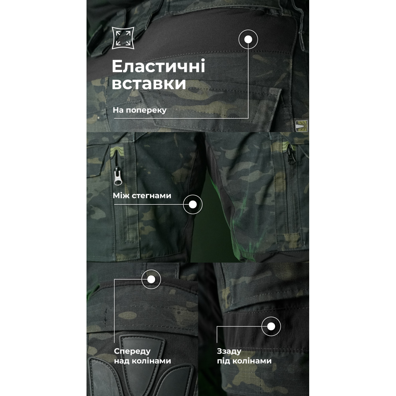 - Виготовлені з витривалих матеріалів: ріп-стоп NYCO, Flex 4 Way Stretch, Cordura 1000D