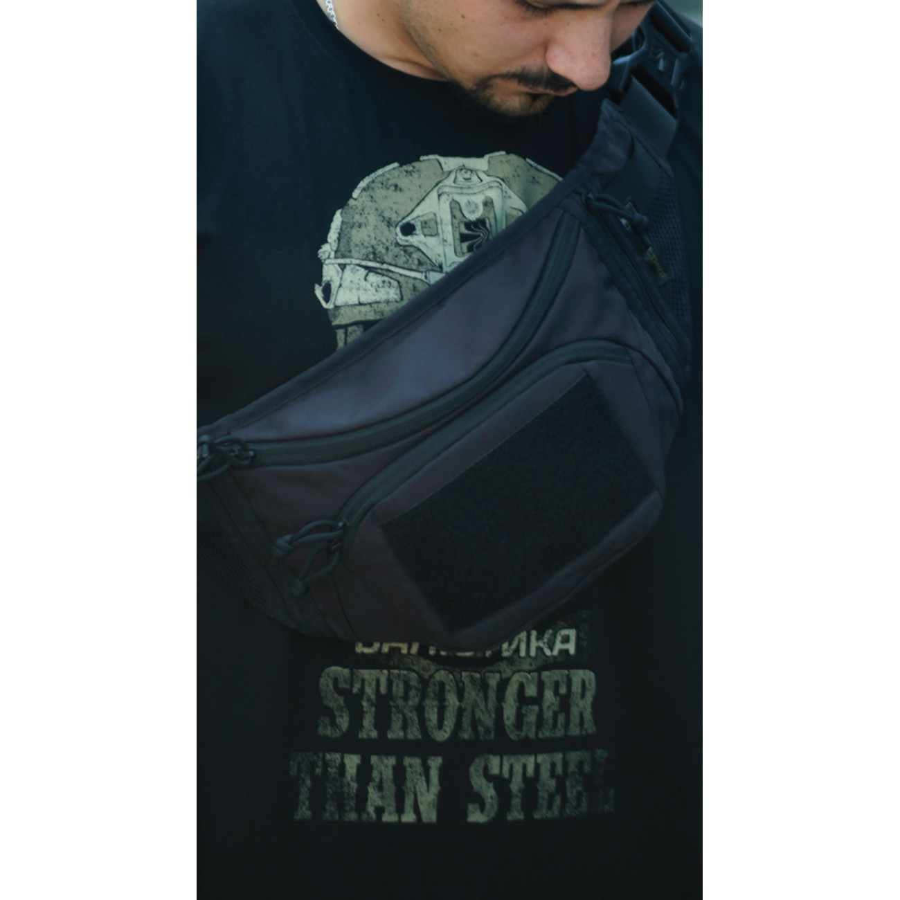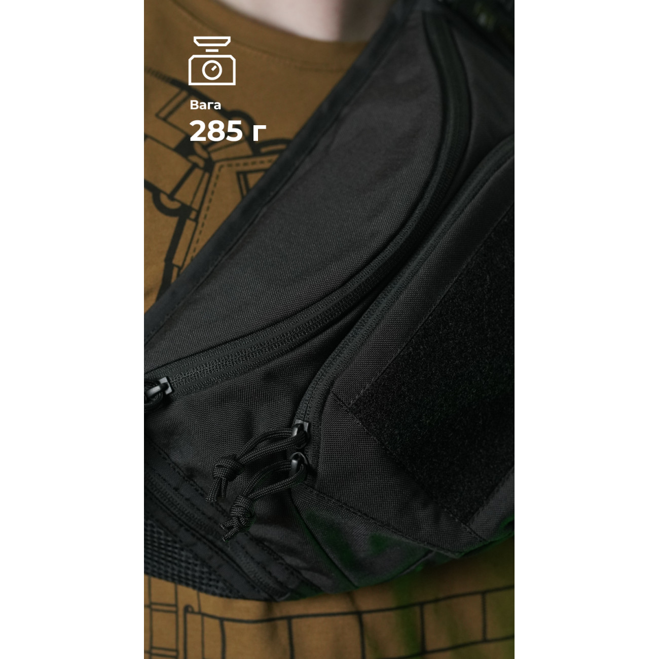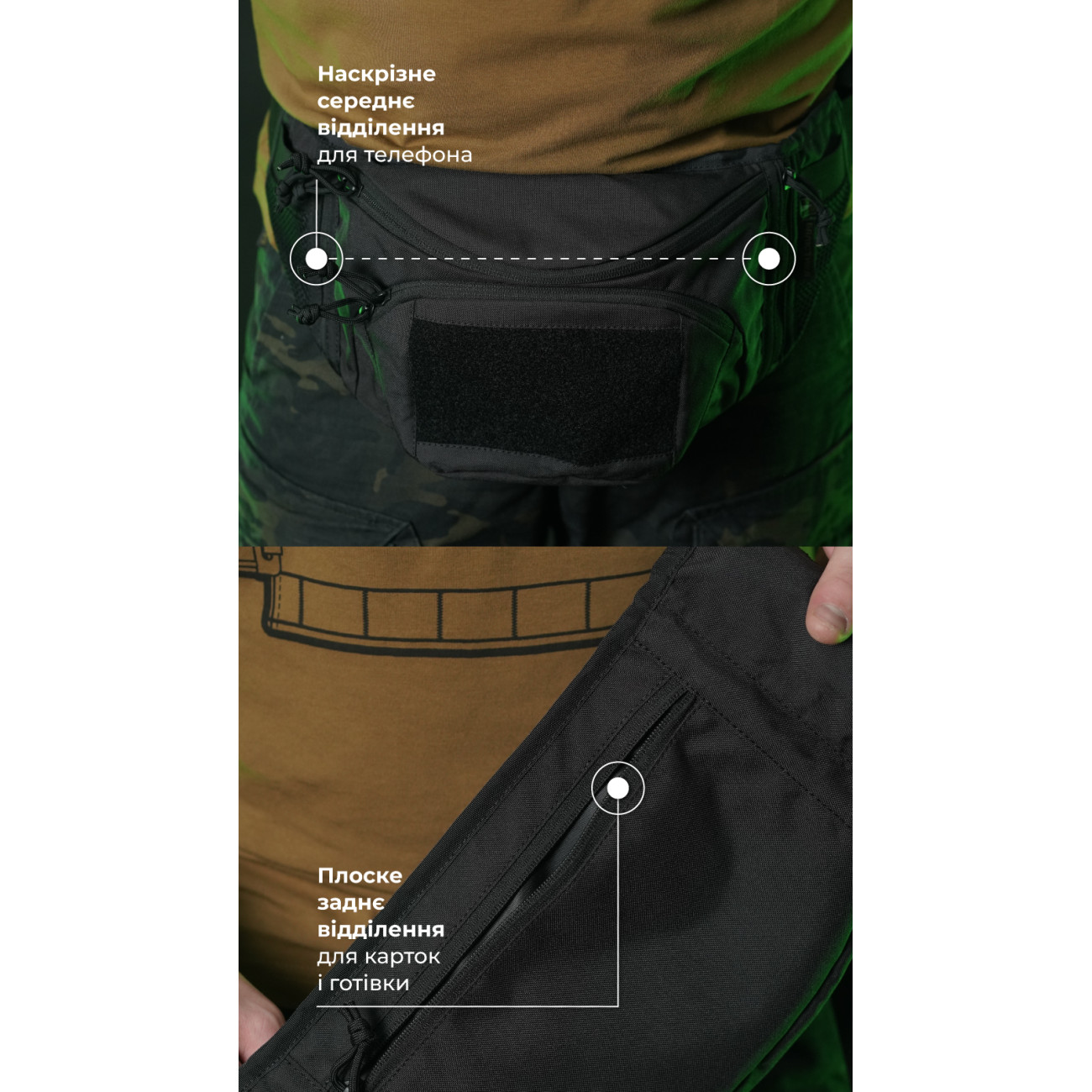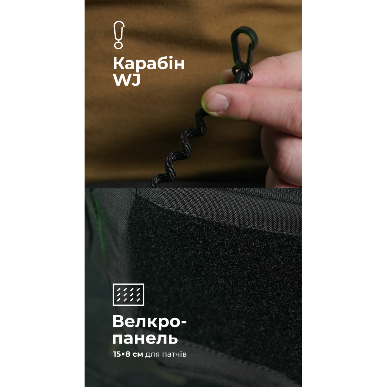 🔹 Переднє відділення (22×13 см) з зовнішньою велкро-панеллю (15×8 см) та мотузкою-спіраллю з карабіном, на який зручно чіпляти ключі або перепустку