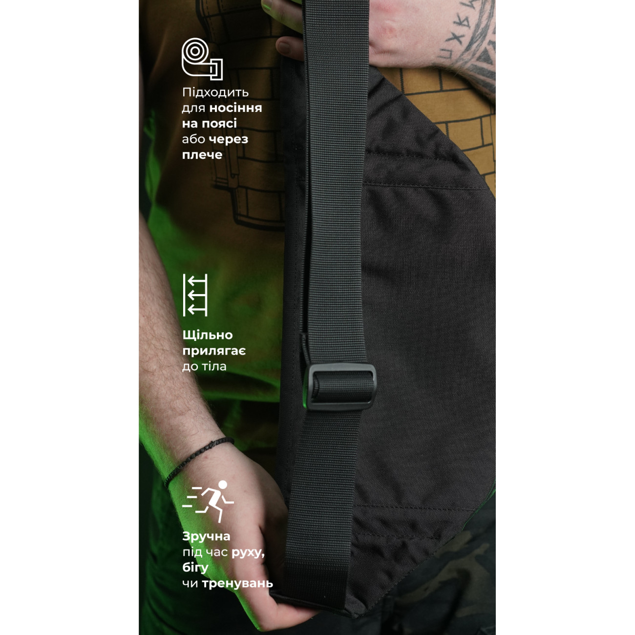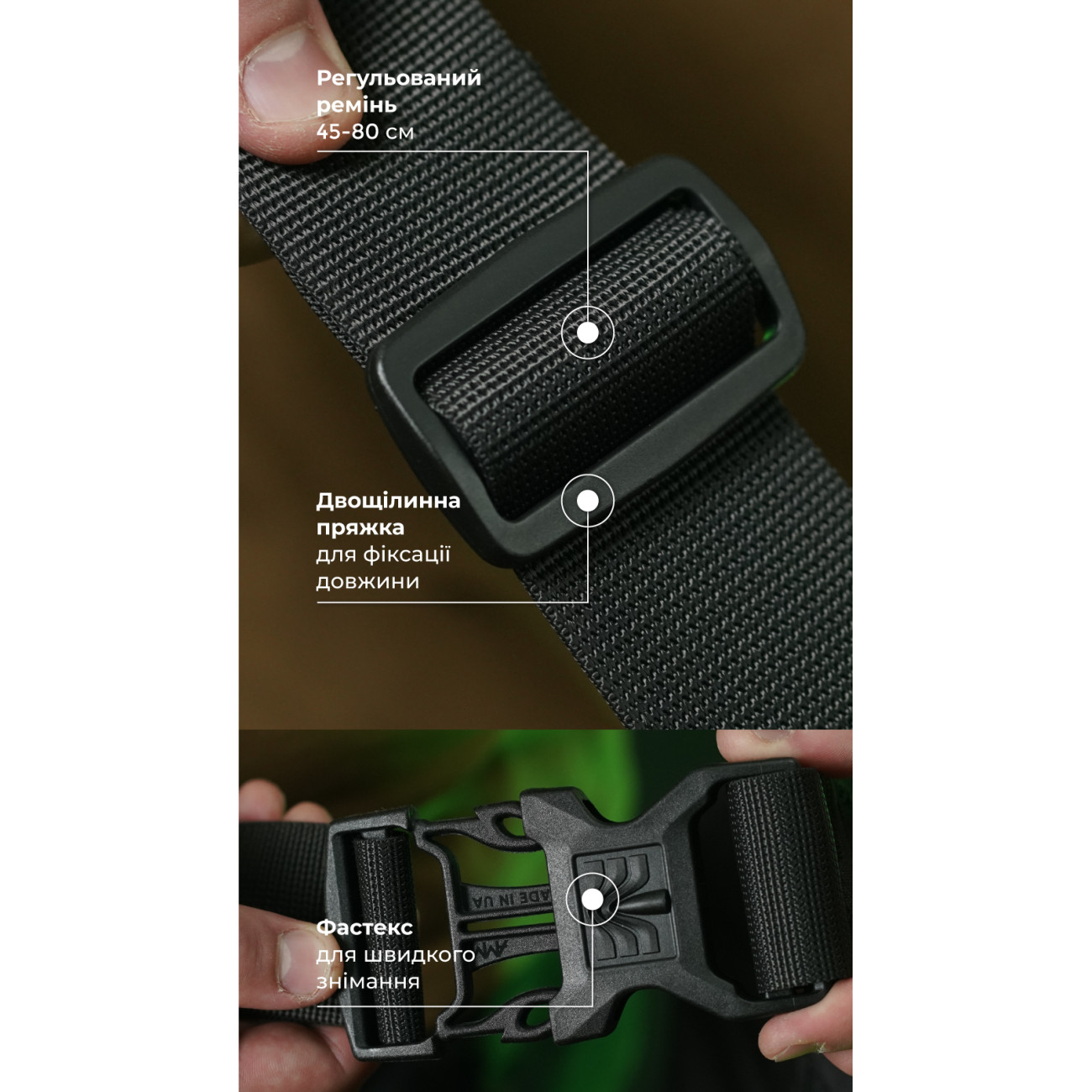 ✔️ Широкий ремінь із масивним фастексом регулюється за довжиною та забезпечує щільне прилягання бананки