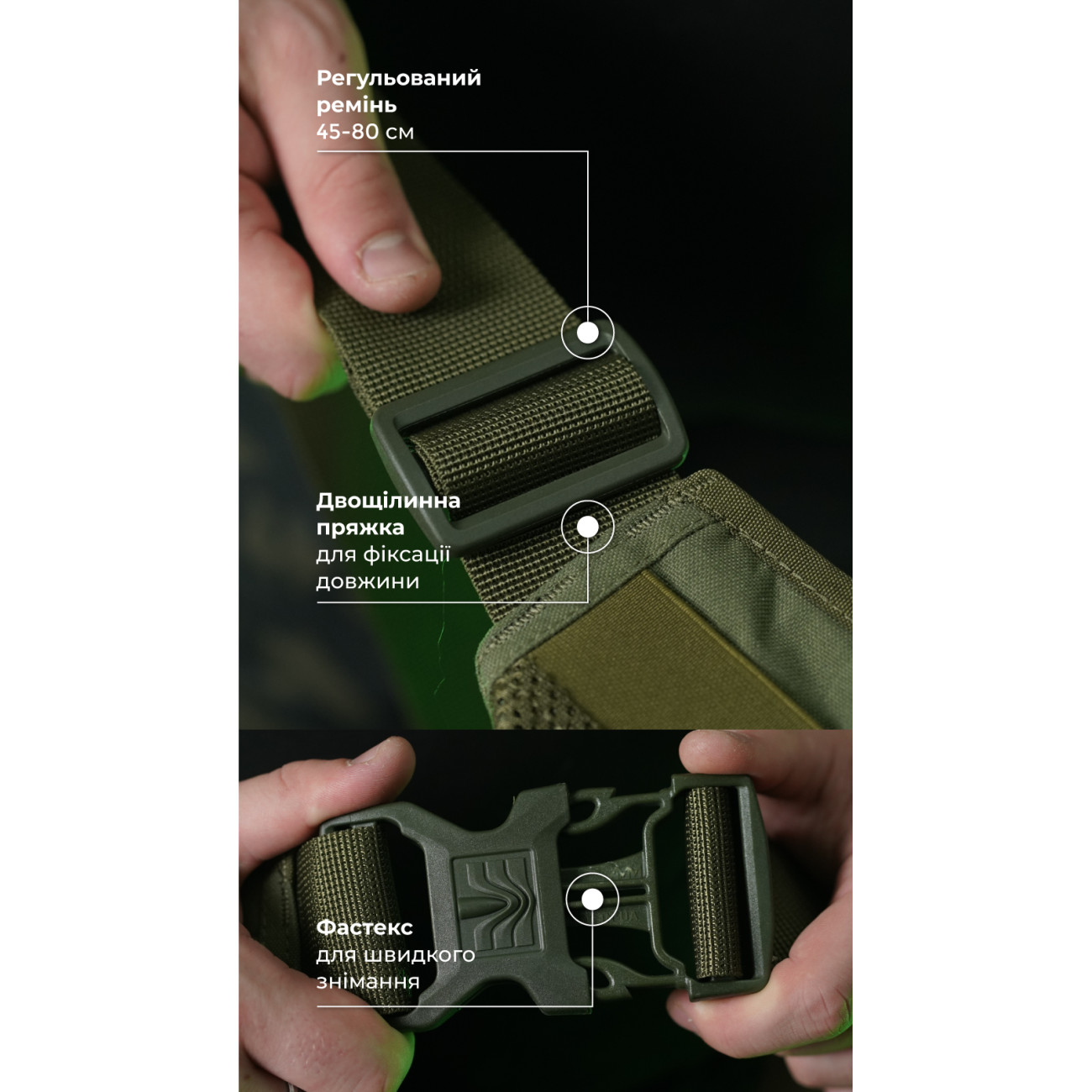 Так, ремінь легко регулюється для обох варіантів: на пояс або на плече.
