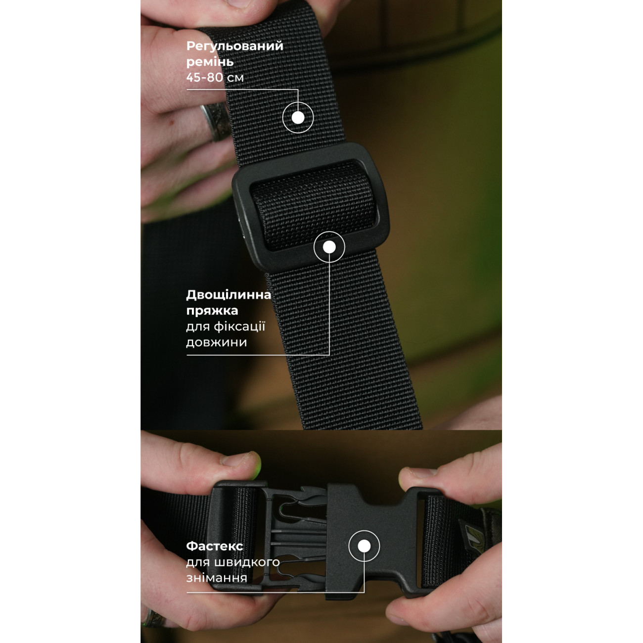 ✔️ Двощілинна пряжка дозволяє регулювати довжину ременя, а фастекс – миттєво знімати або фіксувати бананку на поясі
