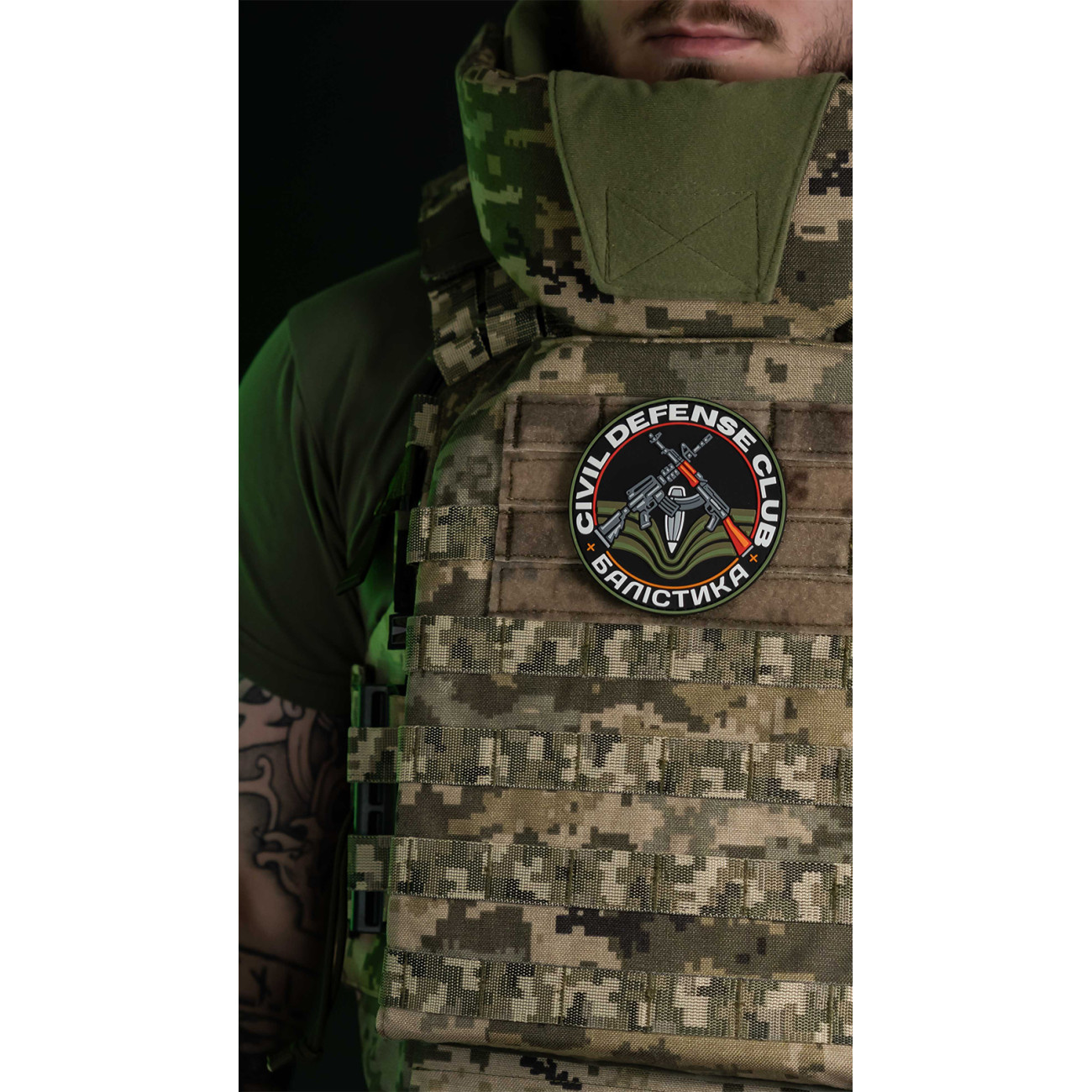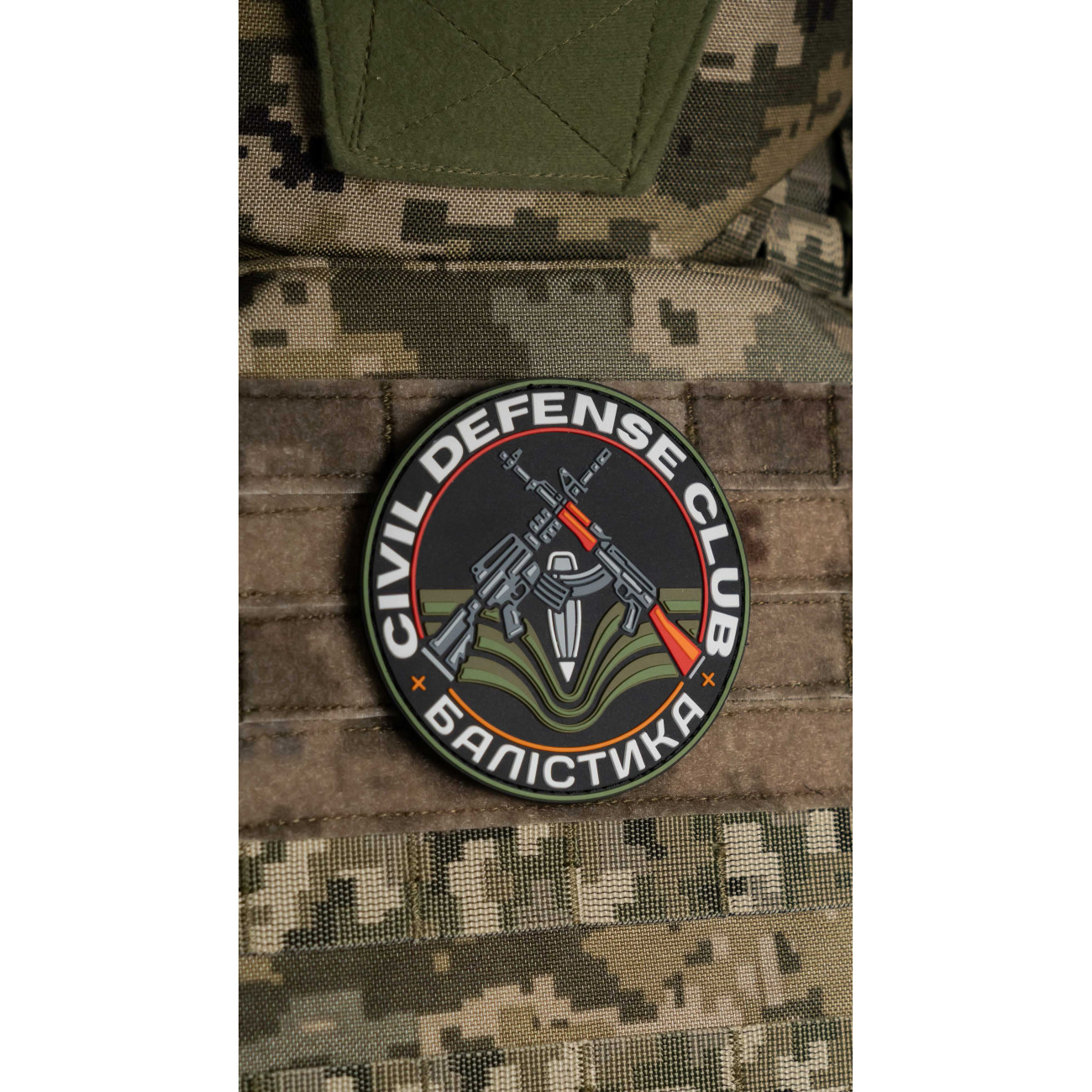 Патч містить напис «Civil Defense Club + Балістика», виконаний з полівінілхлориду, має круглу форму та кріпиться на велкро.