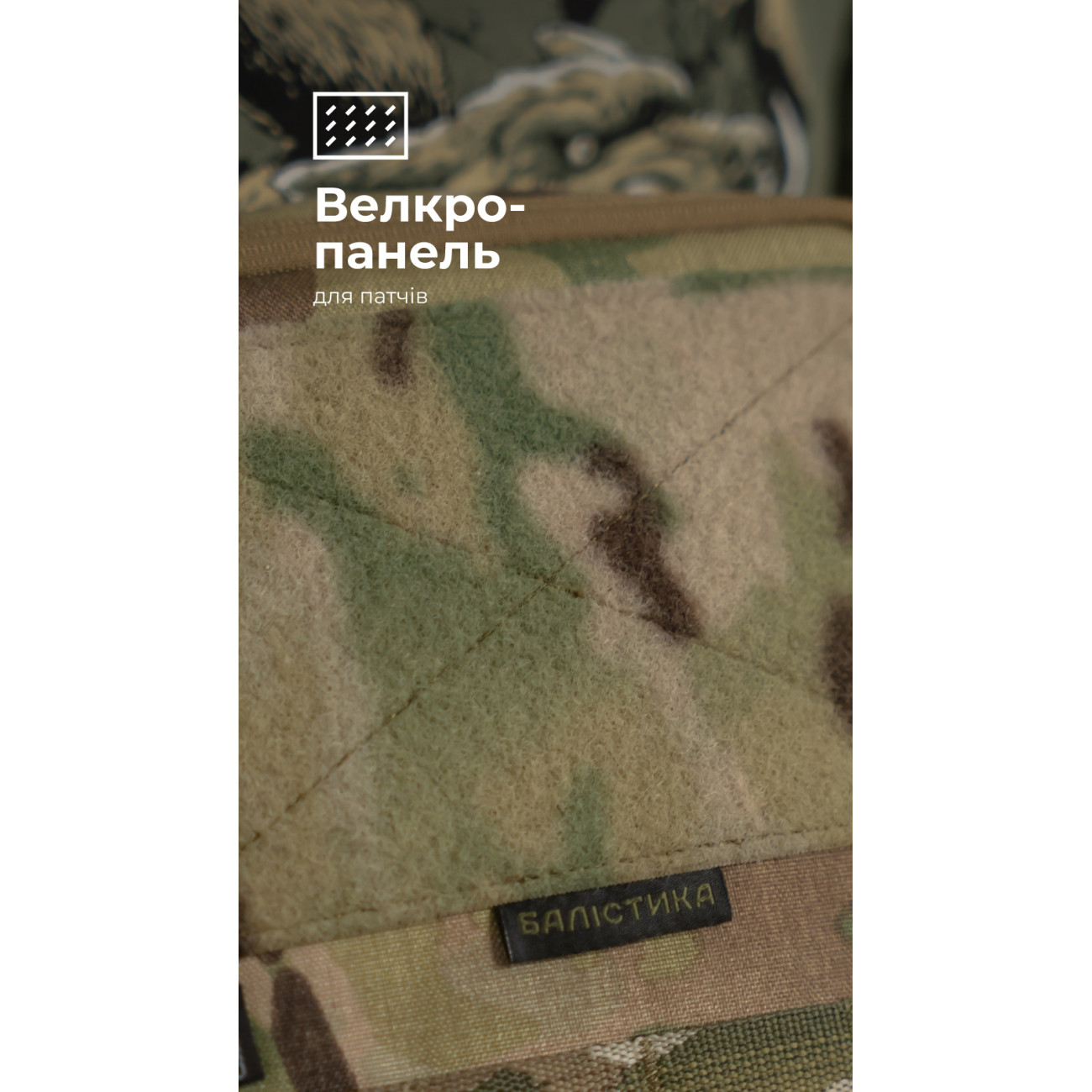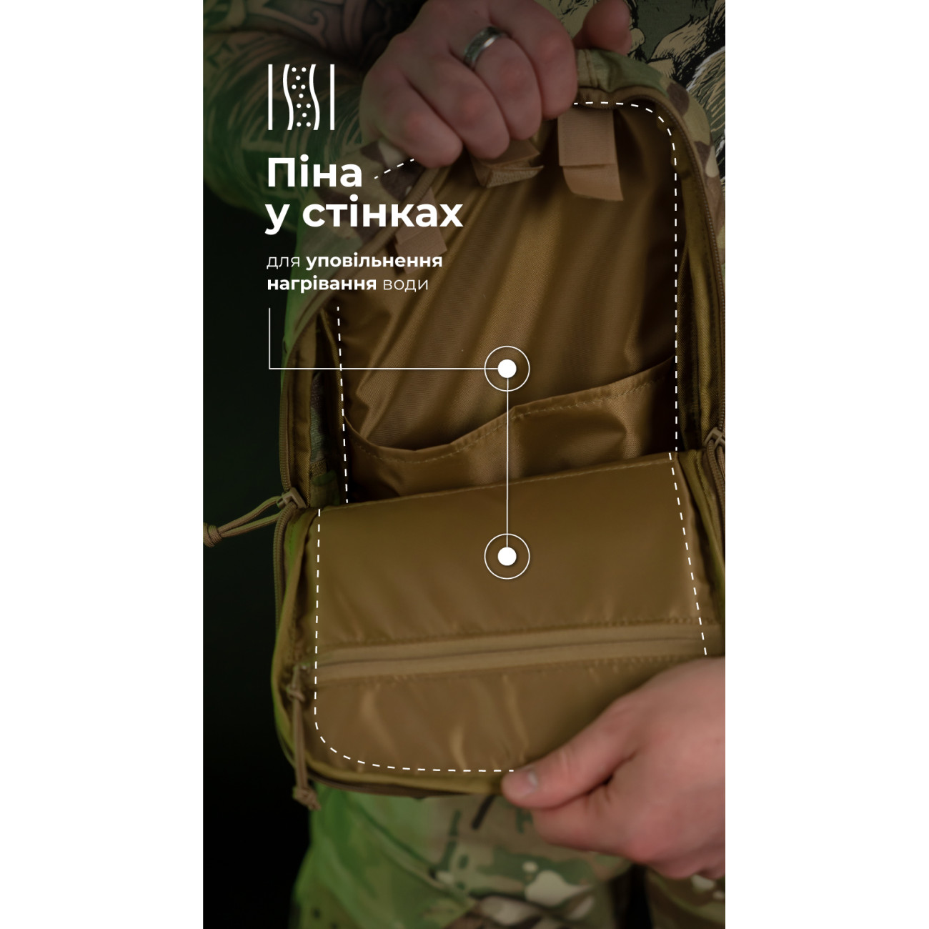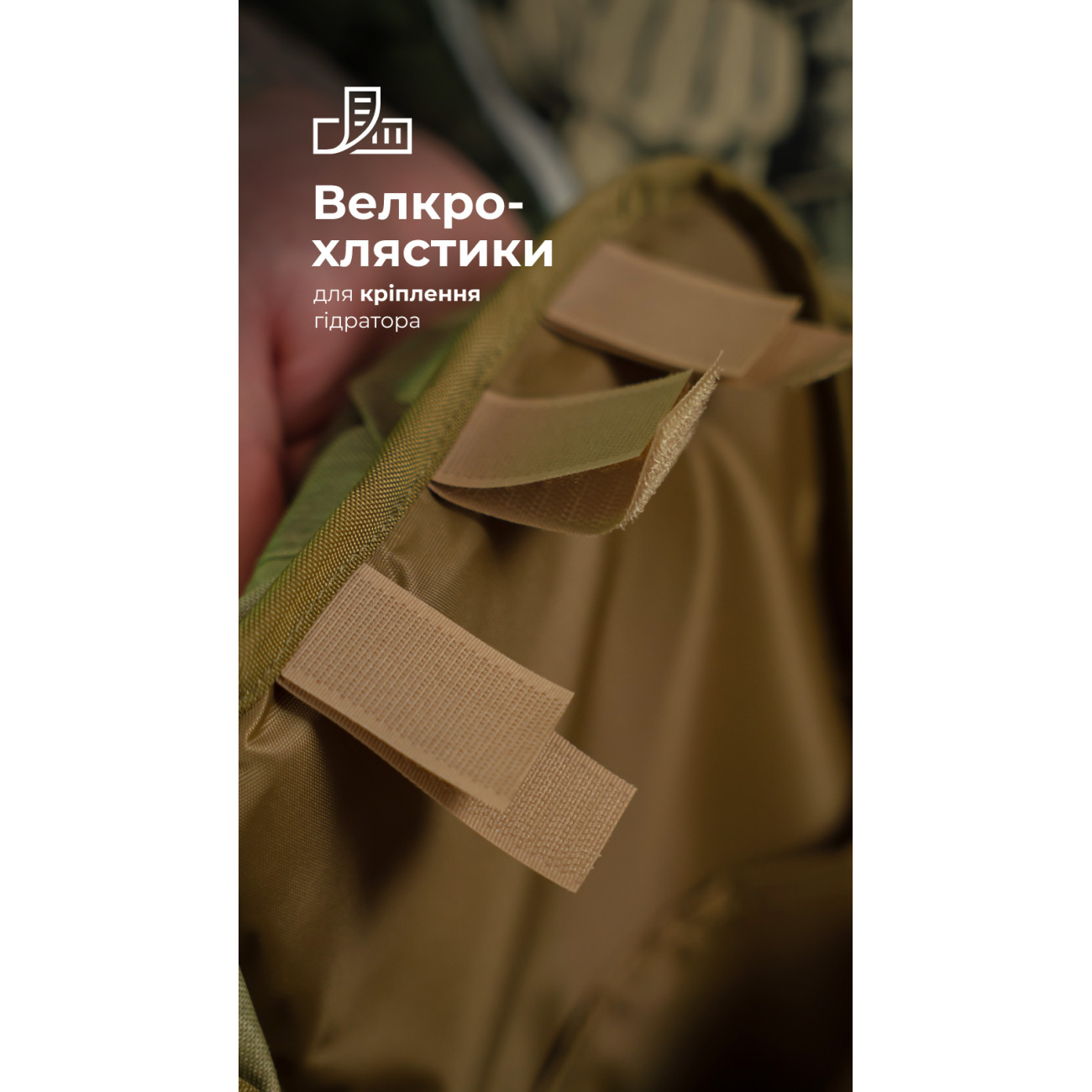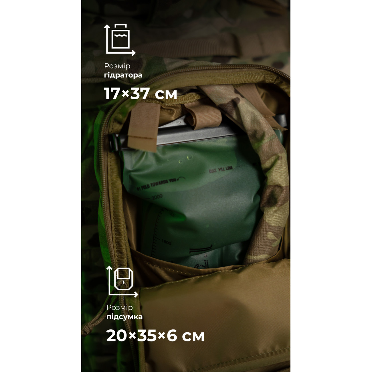 🔹 Підсумок оснащений відкритою кишенею 20×20 см. Об’єм підсумка трохи перевищує розмір дволітрового гідратора, що дозволяє розмістити поряд із ним дрібне спорядження.