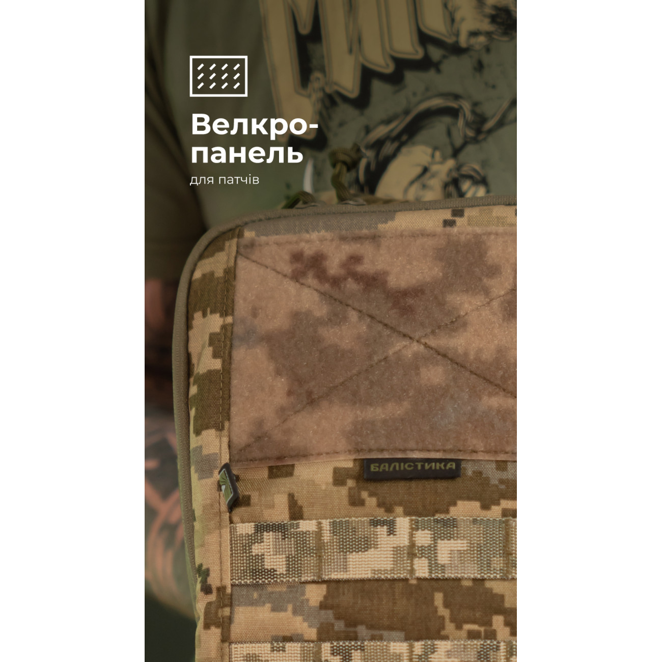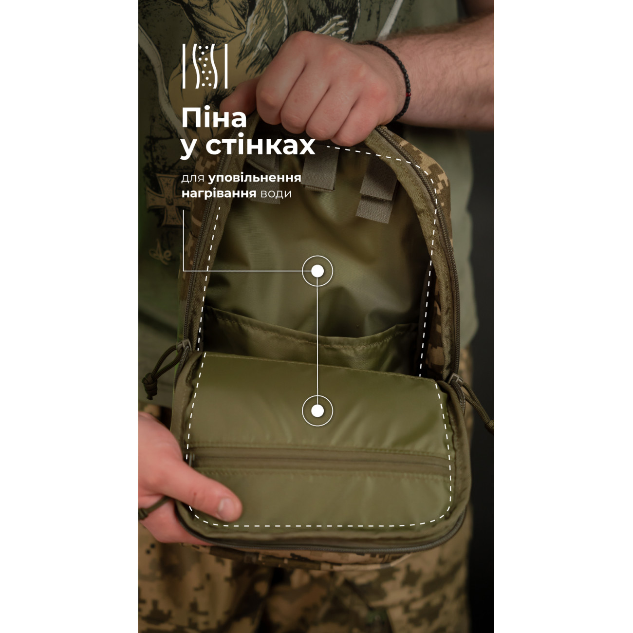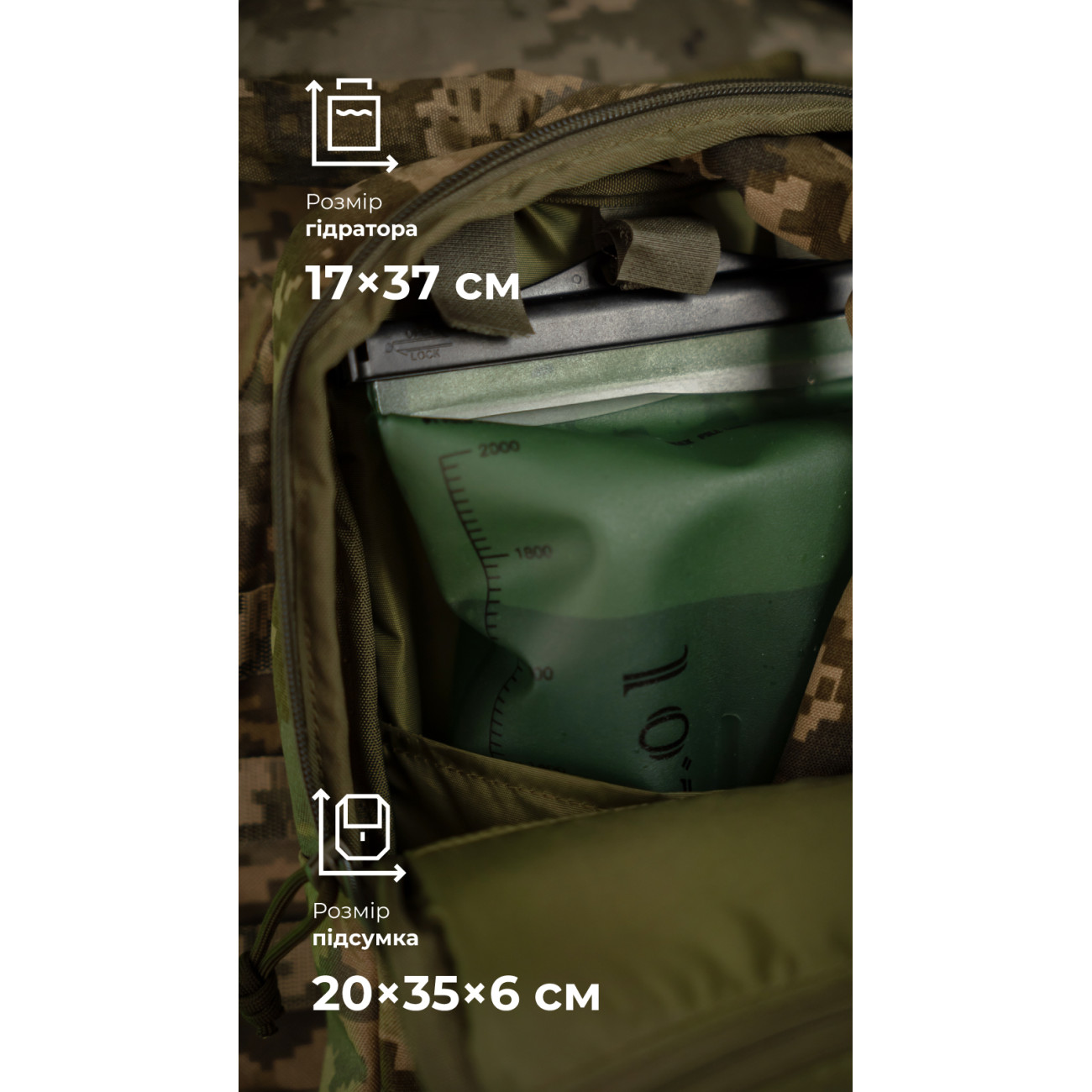🔹 Підсумок оснащений відкритою кишенею 20×20 см. Об’єм підсумка трохи перевищує розмір дволітрового гідратора, що дозволяє розмістити поряд із ним дрібне спорядження.