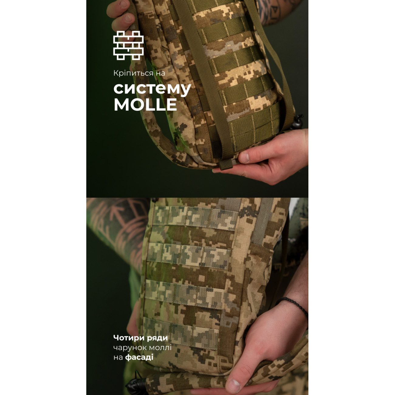 - На фасаді – 4 ряди чарунок моллі для додаткових підсумків, велкро-панель для патчів (15×10 см), а внизу – люверс для дренажу води та сміття.