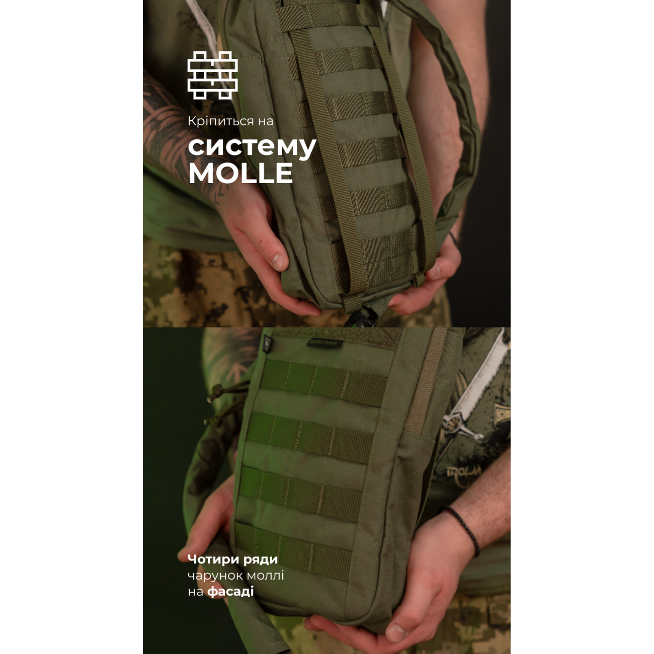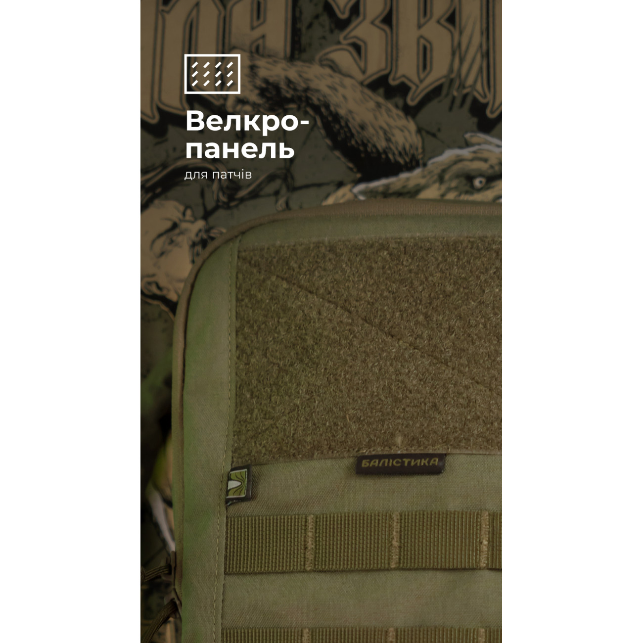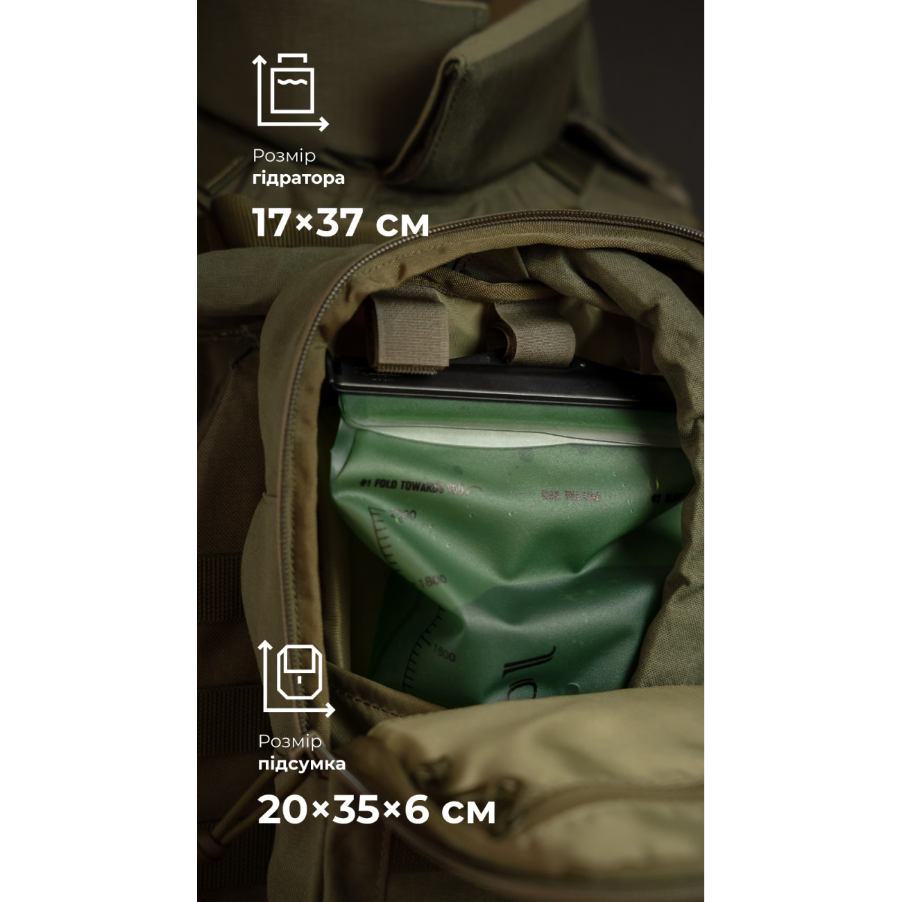 🔹 Підсумок оснащений відкритою кишенею 20×20 см. Об’єм підсумка трохи перевищує розмір дволітрового гідратора, що дозволяє розмістити поряд із ним дрібне спорядження.
