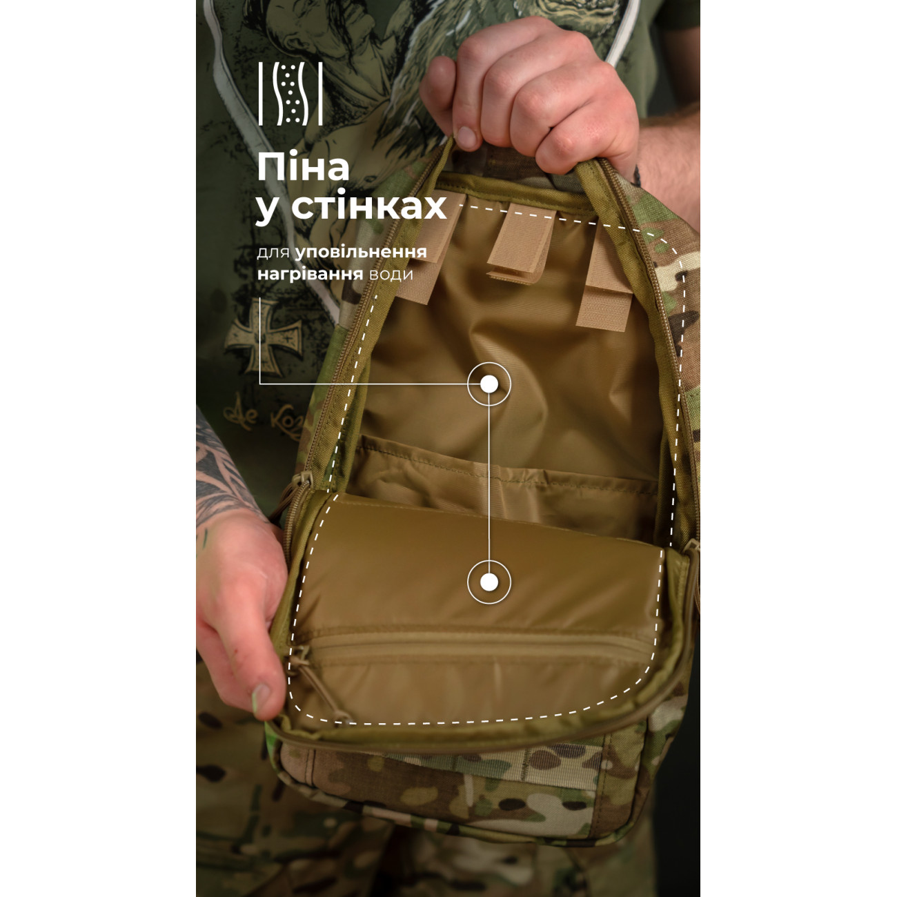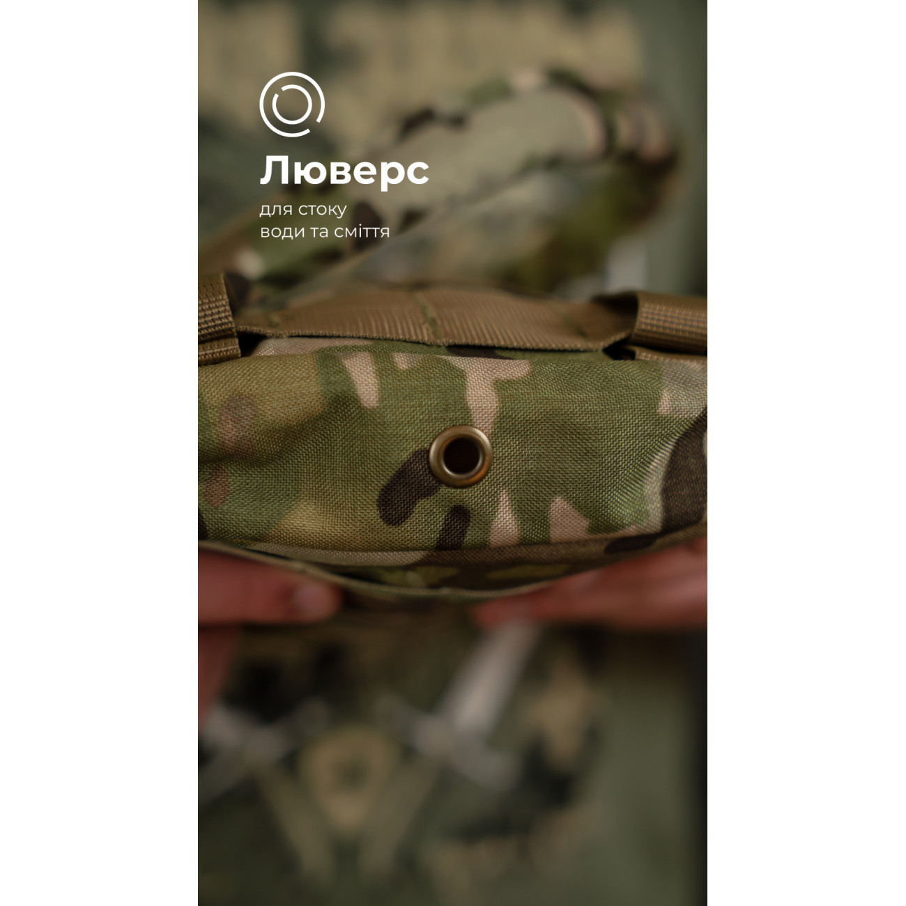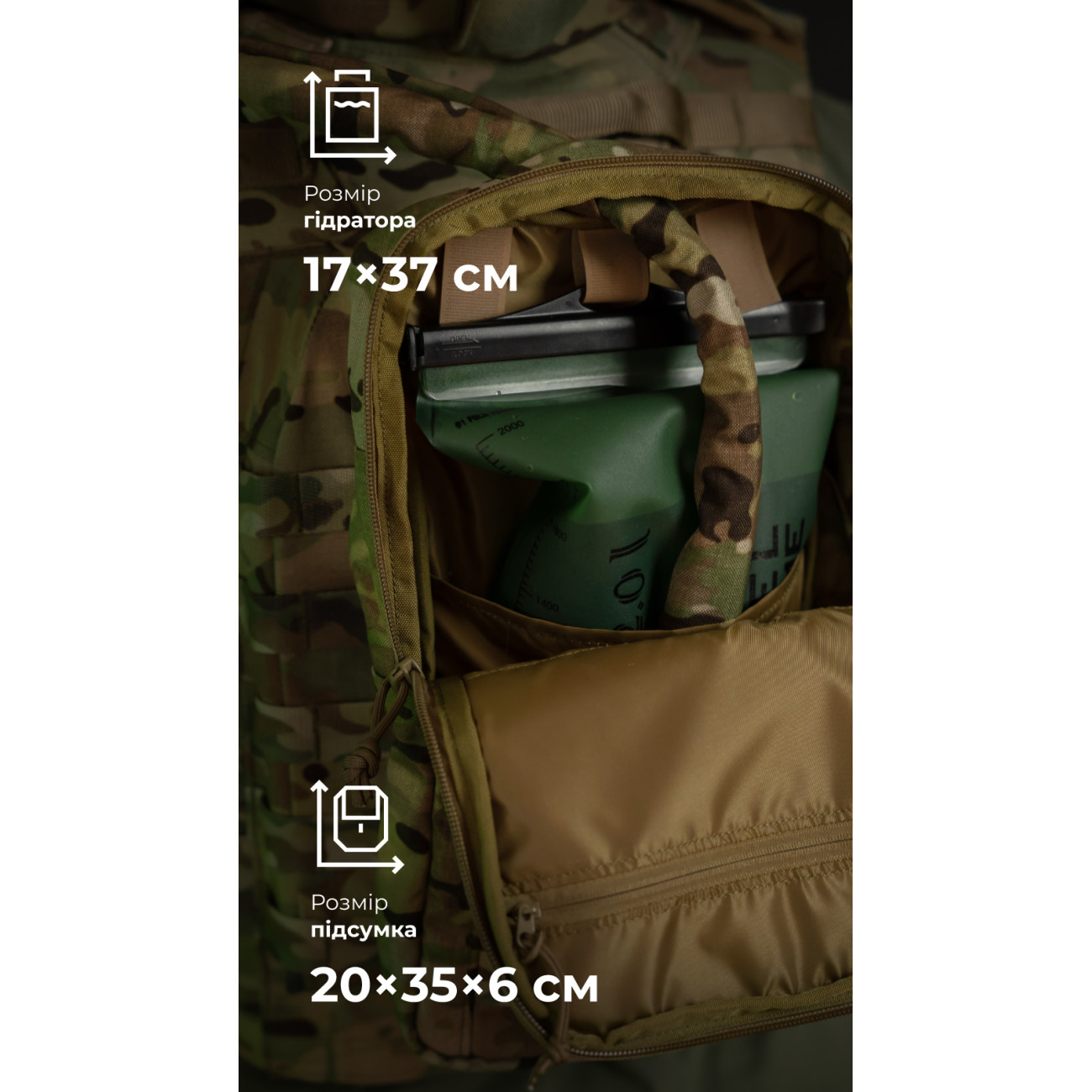 🔹 Підсумок оснащений відкритою кишенею 20×20 см. Об’єм підсумка трохи перевищує розмір дволітрового гідратора, що дозволяє розмістити поряд із ним дрібне спорядження.