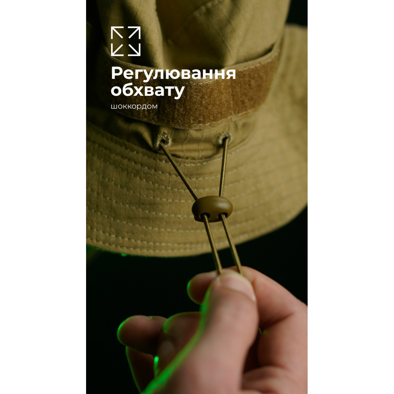 Панама оснащена вшитим паракордом з фіксатором, який можна затягнути під підборіддям. Це дозволяє надійно зафіксувати головний убір навіть за сильних поривів вітру чи активних маневрів.