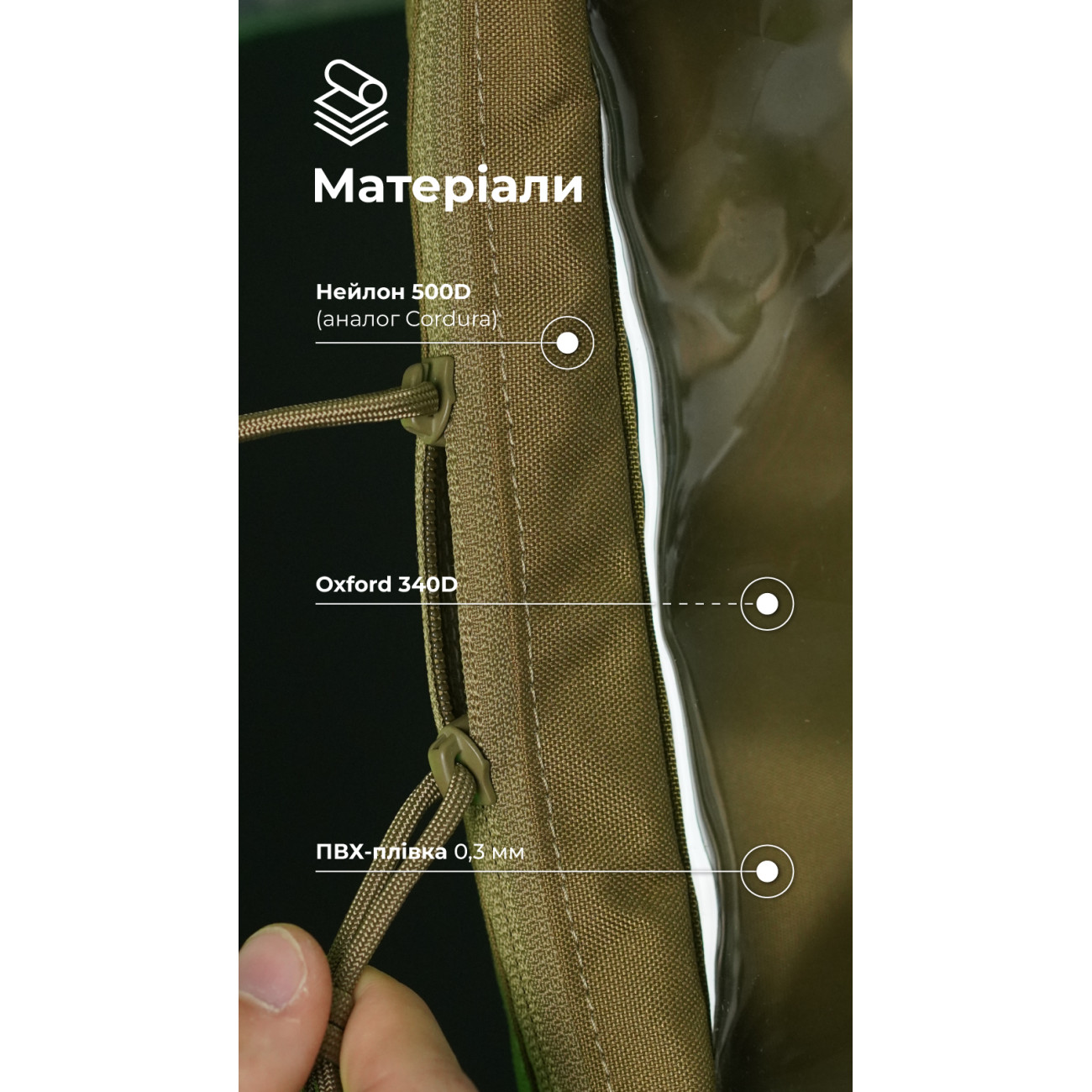 - Витривалі матеріали: нейлон 500D, Oxford 340D, ПВХ-плівка, велкро