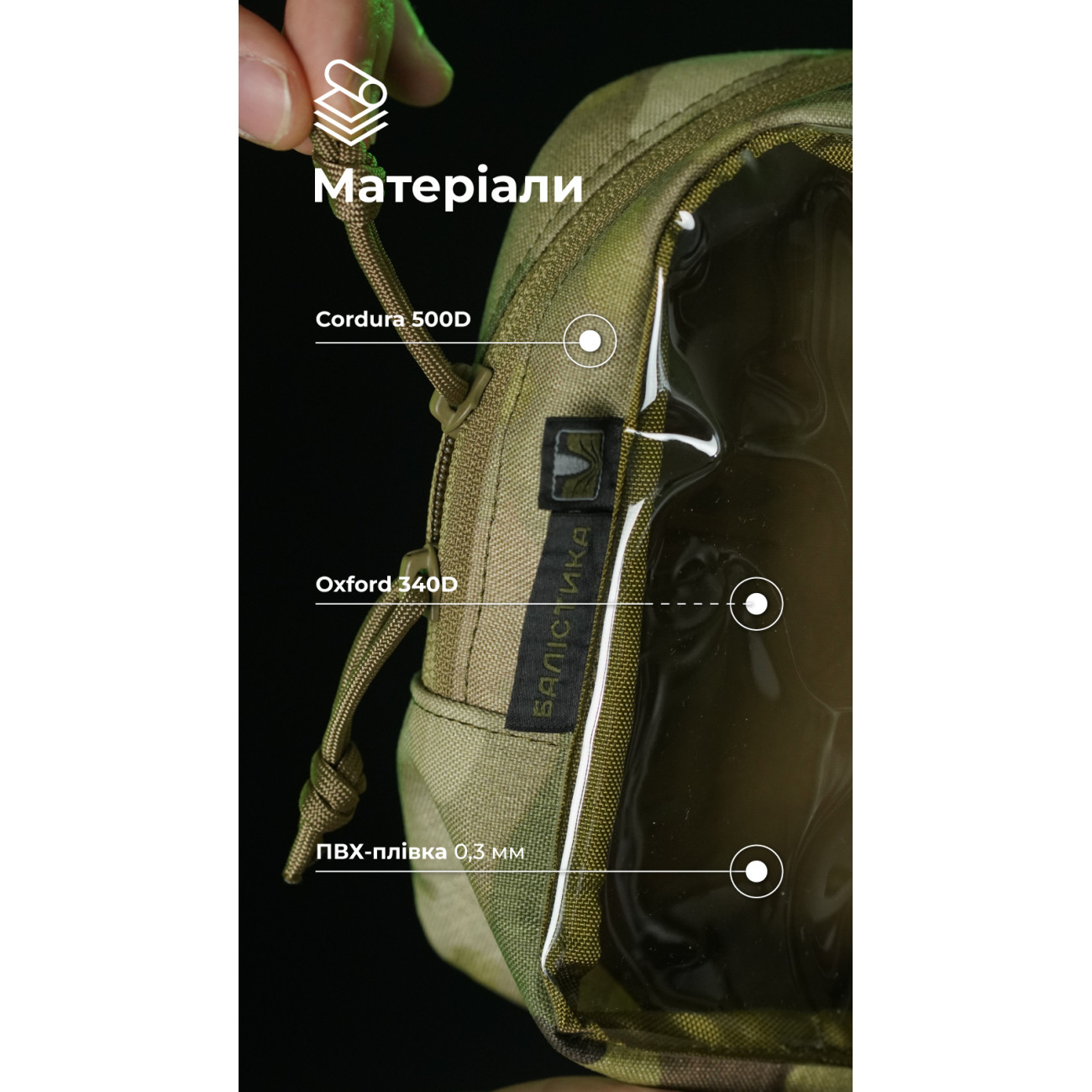 - Витривалі матеріали: нейлон 500D, Oxford 340D, ПВХ-плівка, велкро