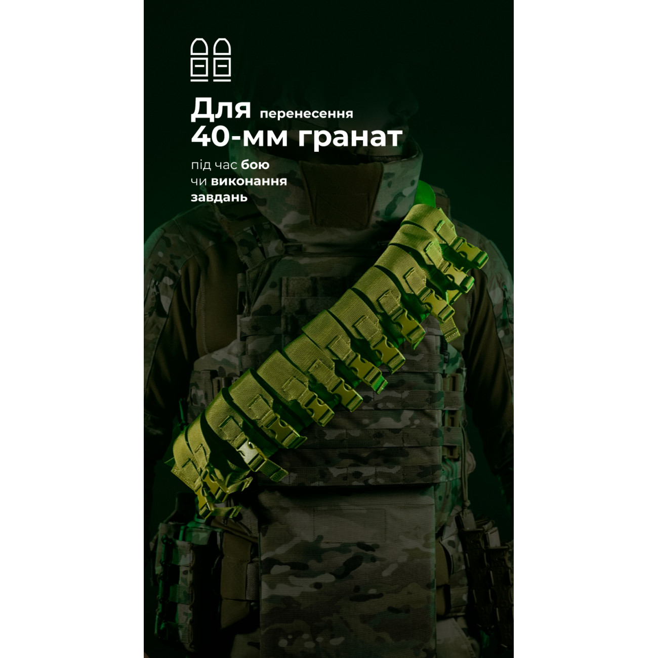 Бандольєра призначена для перенесення 40-міліметрових гранат у ході бою та під час виконання інших завдань. Вона дозволяє надійно фіксувати боєкомплект та не вимагає змін в основному комплекті спорядження – достатньо просто перекинути її через плече.