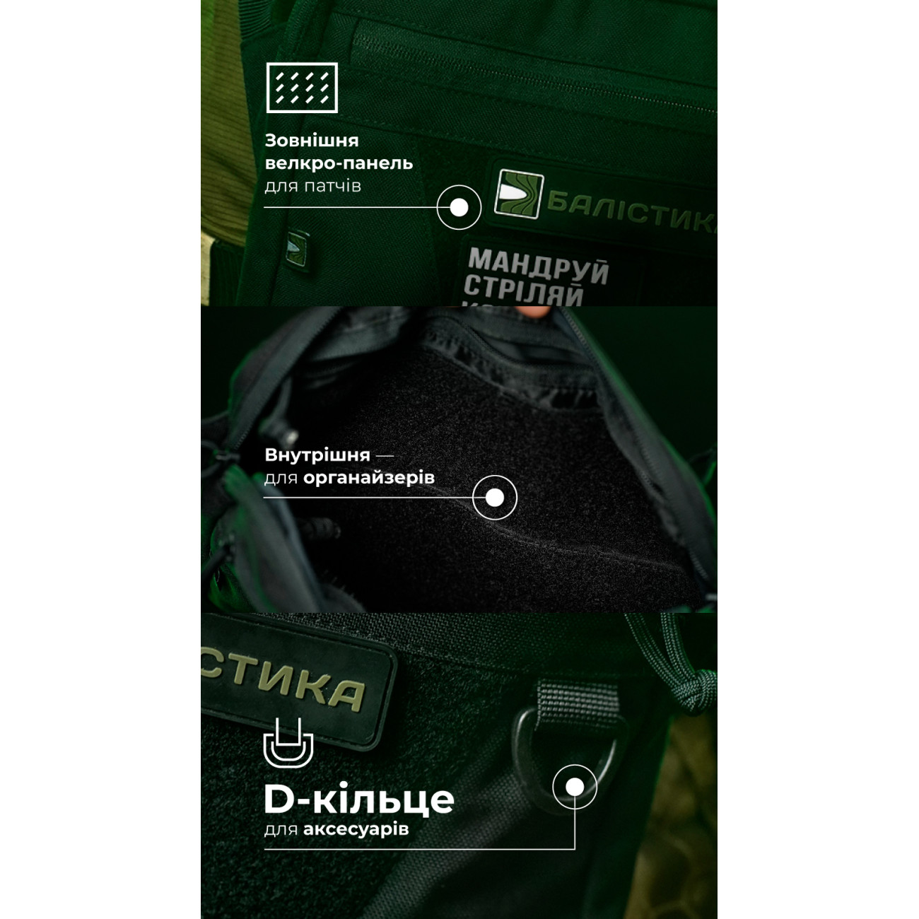 ✔️ На фасаді розміщена фігурна велкро-панель (17×9 см) для патчів і D-кільце для підвішування аксесуарів, брелоків.