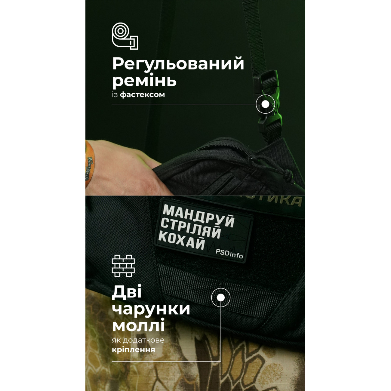 ✔️ Сумка доповнена ремінцем зі стропи, який вшитий у бокові «крильця» під кутом – для зручнішого носіння через плече. Ремінець обладнаний фастексом для швидкого зняття та регулюється за довжиною.