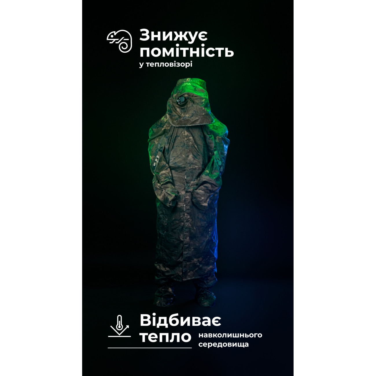 - Маскує від тепловізора і допомагає бійцю дійти до позицій