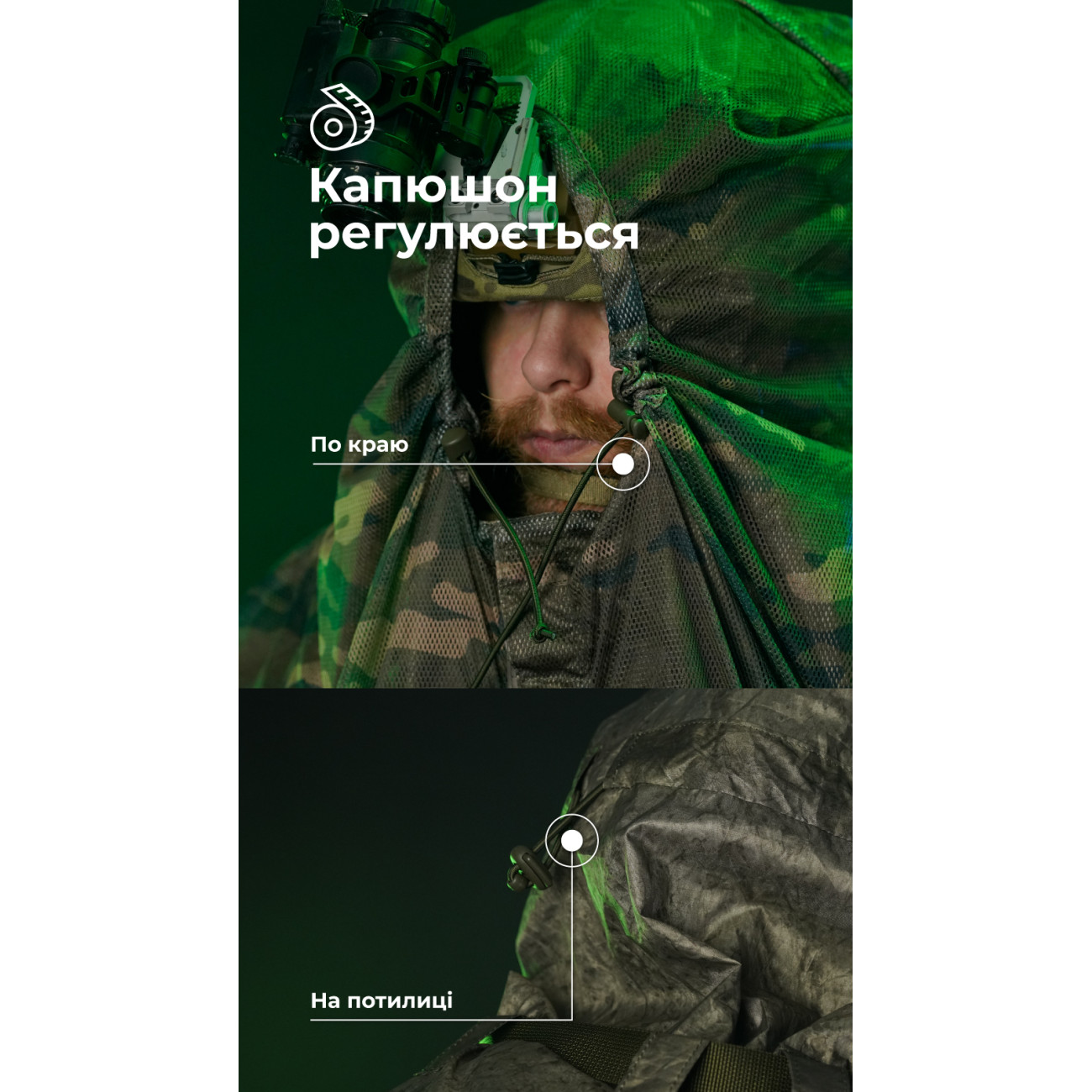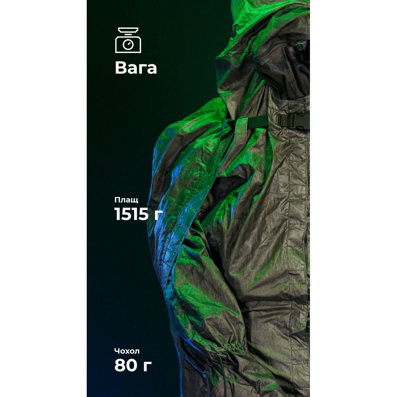🔹 Вільний крій та легка вага. Великий об’єм пончо дає змогу надягти під нього бронежилет, шолом із навушниками та тактичний рюкзак. При цьому завдяки тонкій структурі та легкій вазі воно не сковує рухів.