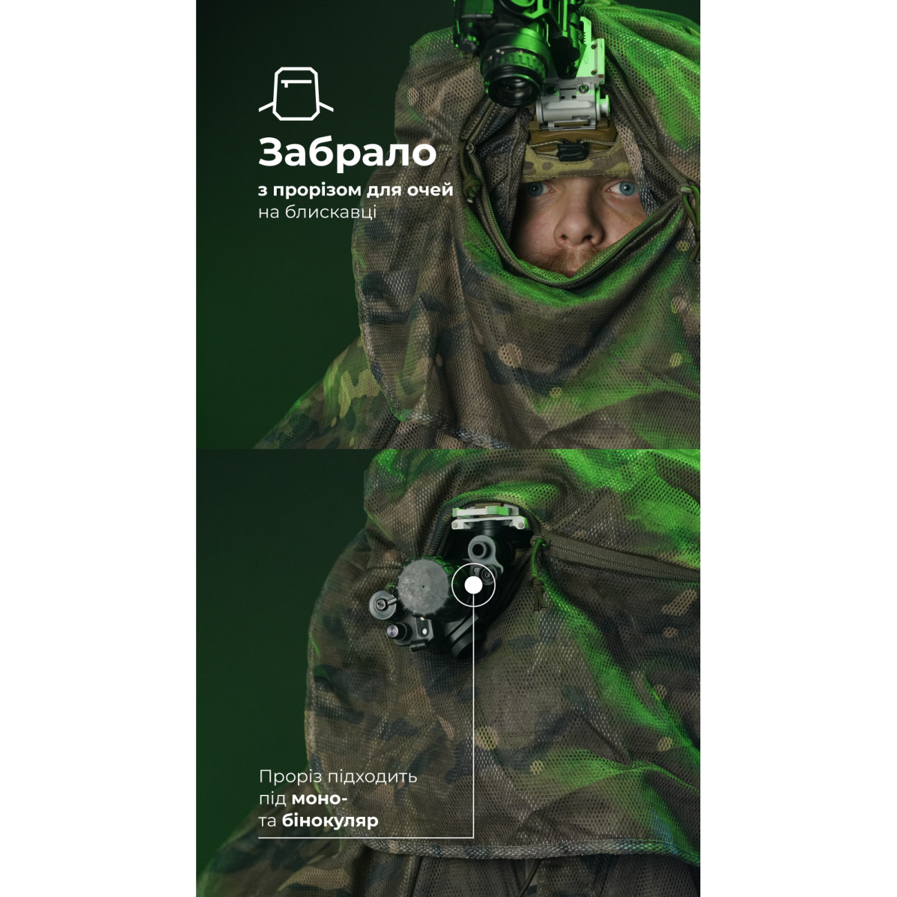 ✔️ Оснащений перекидним забралом, яке приховує обличчя від виявлення. На рівні очей у ньому вшита блискавка (27 см) з двома бігунками, які дають змогу змінювати розмір прорізу. Це дає змогу адаптувати його під тепловізійні пристрої (монокуляр чи бінокуляр) без відкриття обличчя.