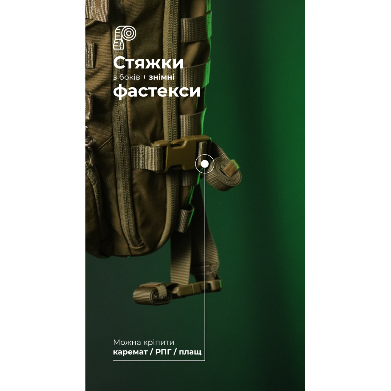 ✔️ Фастекси на стяжках знімні, і за потреби їх можна перемістити на петлі на чарунках моллі й збільшити об’єм кріплення. Але слід пам’ятати, що в такому разі буде заблоковане швидке розкриття переднього відділення.
