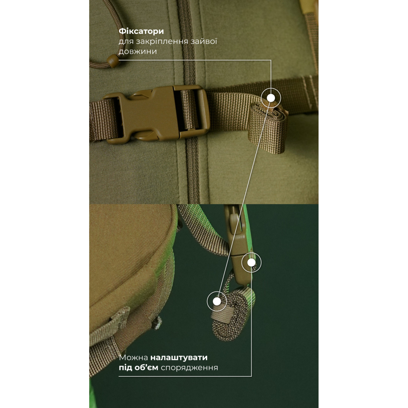 🔹 Плоскі лямки виконані з широкої стропи (5 см). Вони дозволяють зручно й ефективно вести вогонь, не знімаючи рюкзак з бронежилета. Довжину лямок можна регулювати, а зайву (до 50 см) – закріплювати велкро-хлястиками.