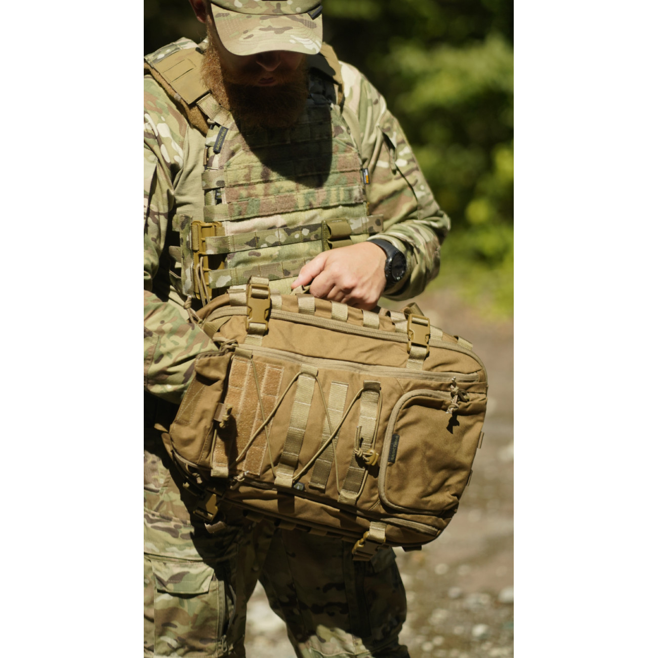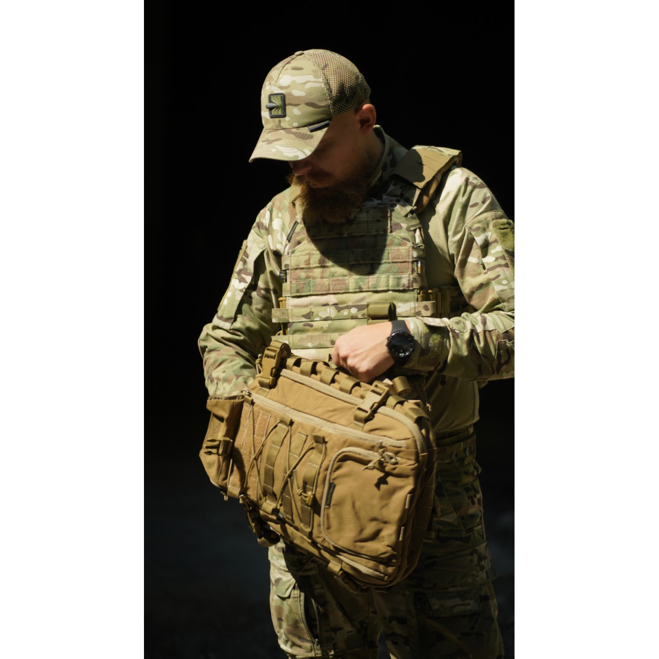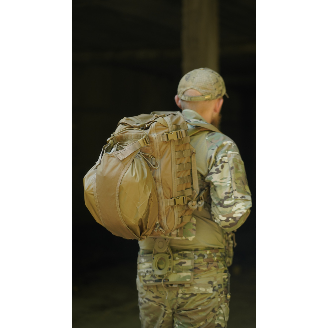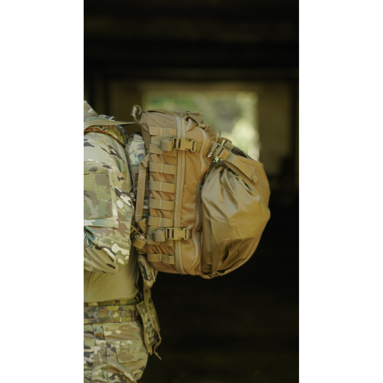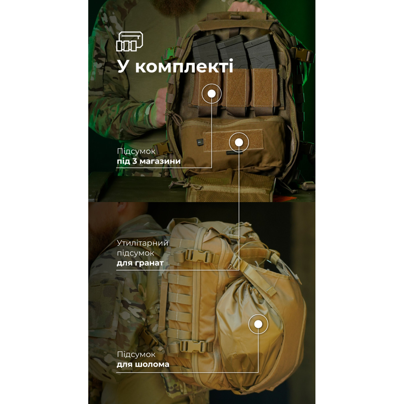 Підсумки для боєприпасів можна закріпити на велику велкро-панель у передньому відділенні. Підсумок для шолома фіксується до строп на фасаді за допомогою карабінів. Також за потреби ви можете встановити додаткові підсумки на зовнішню сторону рюкзака.