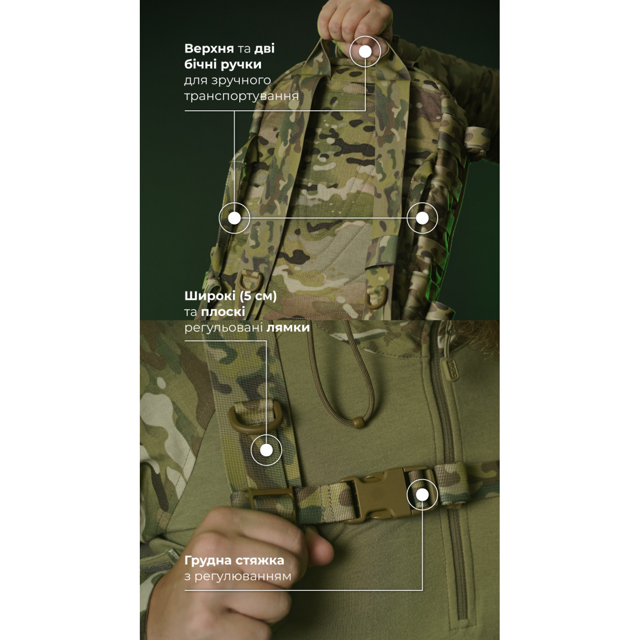 🔹 Плоскі лямки виконані з широкої стропи (5 см). Вони дозволяють зручно й ефективно вести вогонь, не знімаючи рюкзак з бронежилета. Довжину лямок можна регулювати, а зайву (до 50 см) – закріплювати велкро-хлястиками.