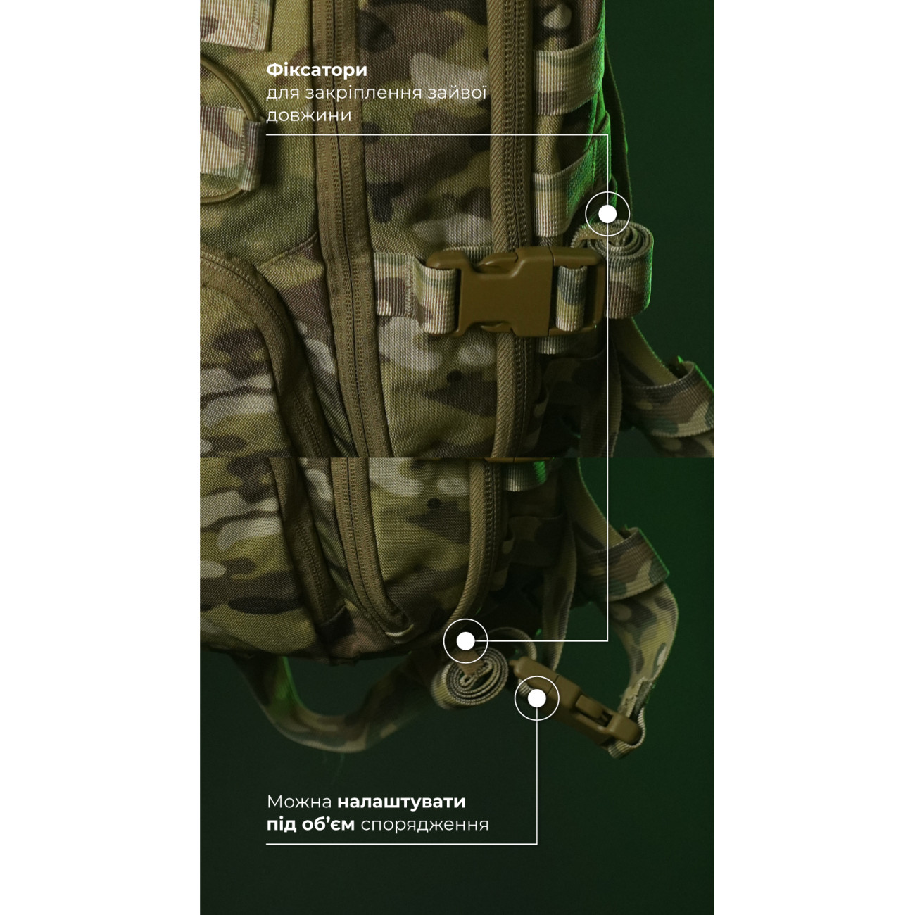✔️ Фастекси на стяжках знімні, і за потреби їх можна перемістити на петлі на чарунках моллі й збільшити об’єм кріплення. Але слід пам’ятати, що в такому разі буде заблоковане швидке розкриття переднього відділення.