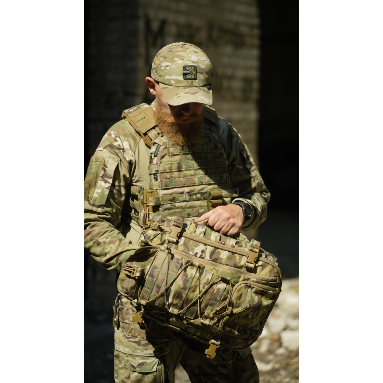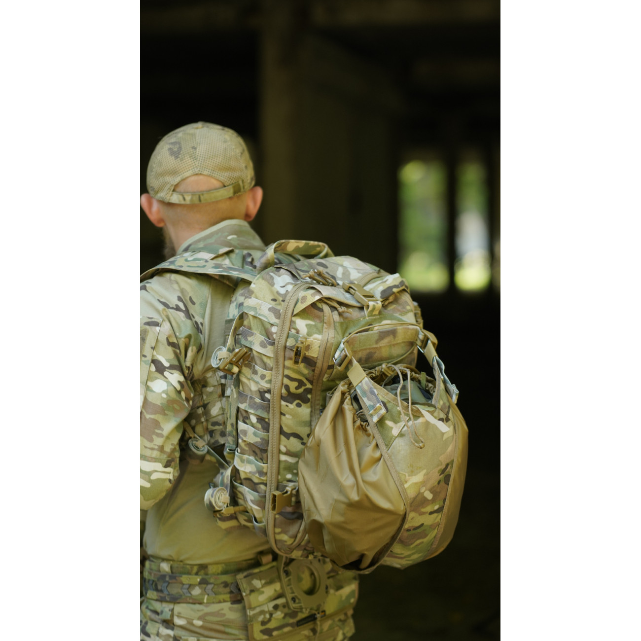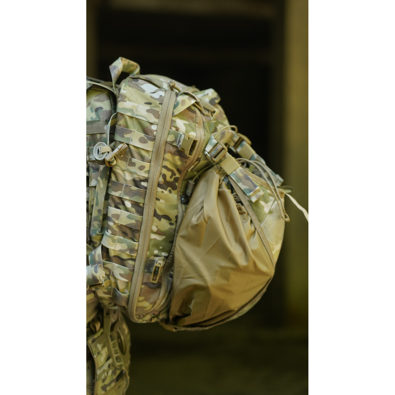 Підсумки для боєприпасів можна закріпити на велику велкро-панель у передньому відділенні. Підсумок для шолома фіксується до строп на фасаді за допомогою карабінів. Також за потреби ви можете встановити додаткові підсумки на зовнішню сторону рюкзака.