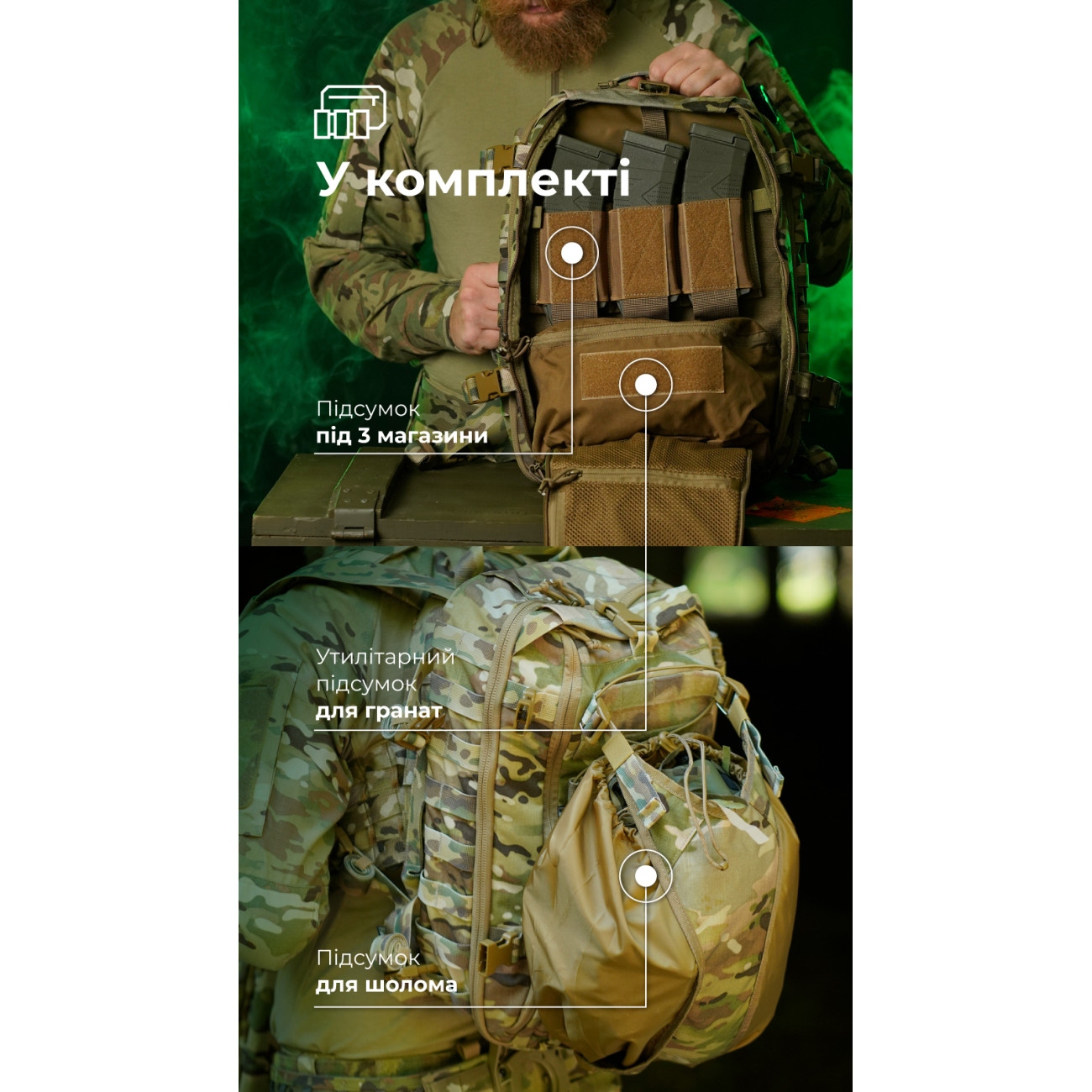 - У комплекті утилітарний підсумок та підсумок під магазини на велкро, а також підсумок для шолома