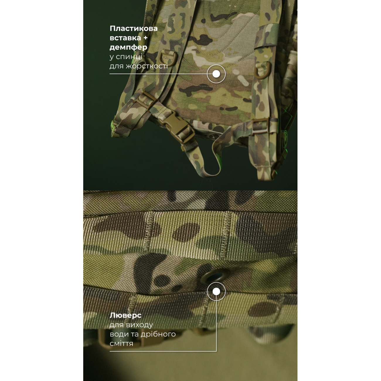 🔹 На дні рюкзака вміщені стропи, через які можна протягнути стяжки чи шнурки для додаткового спорядження. Також тут є люверс.