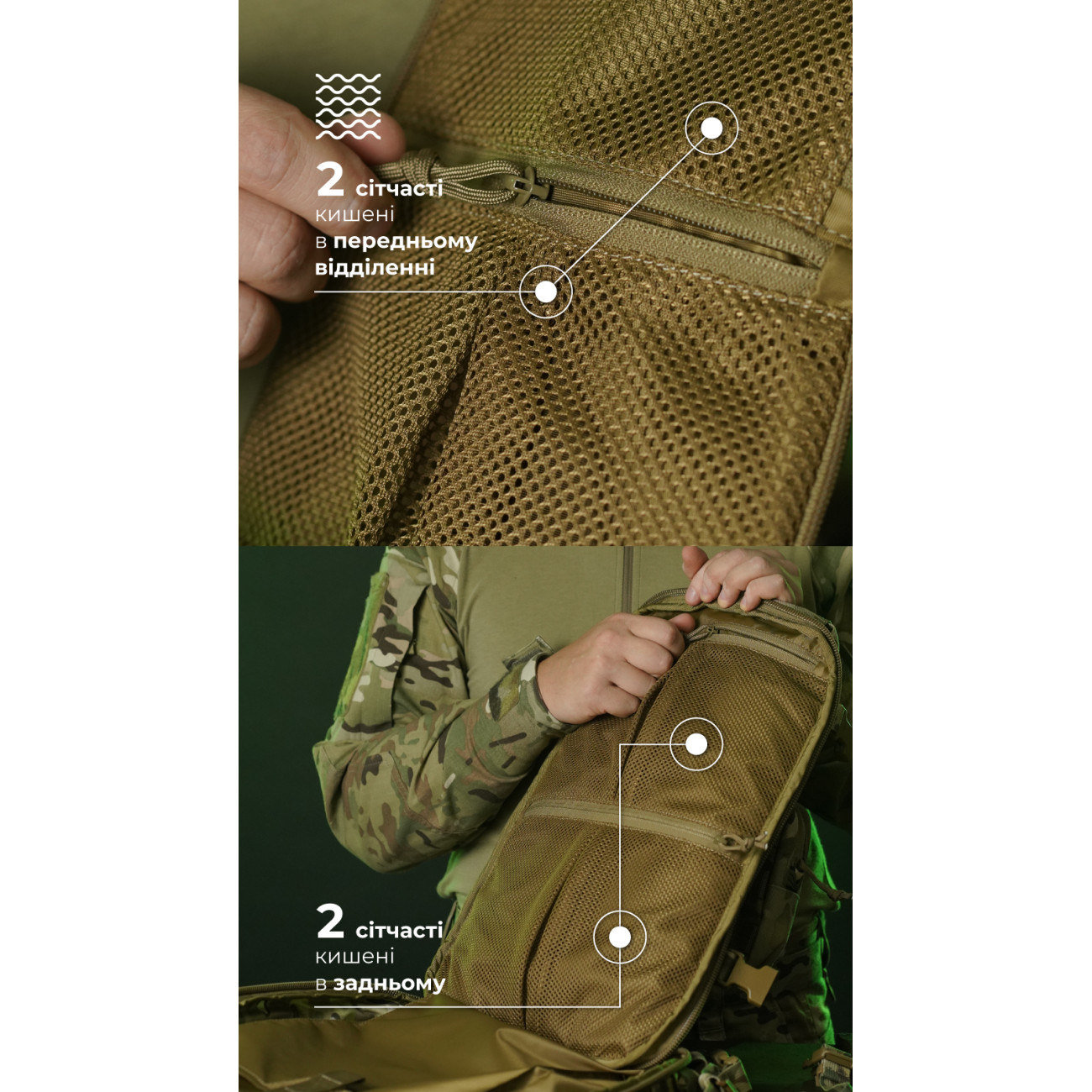 🔹 Крізь чарунки на фасаді протягнута «павутинка» з шоккорду з фіксатором, під яку можна закріпити дощовик, маскувальну сітку, фліску тощо.