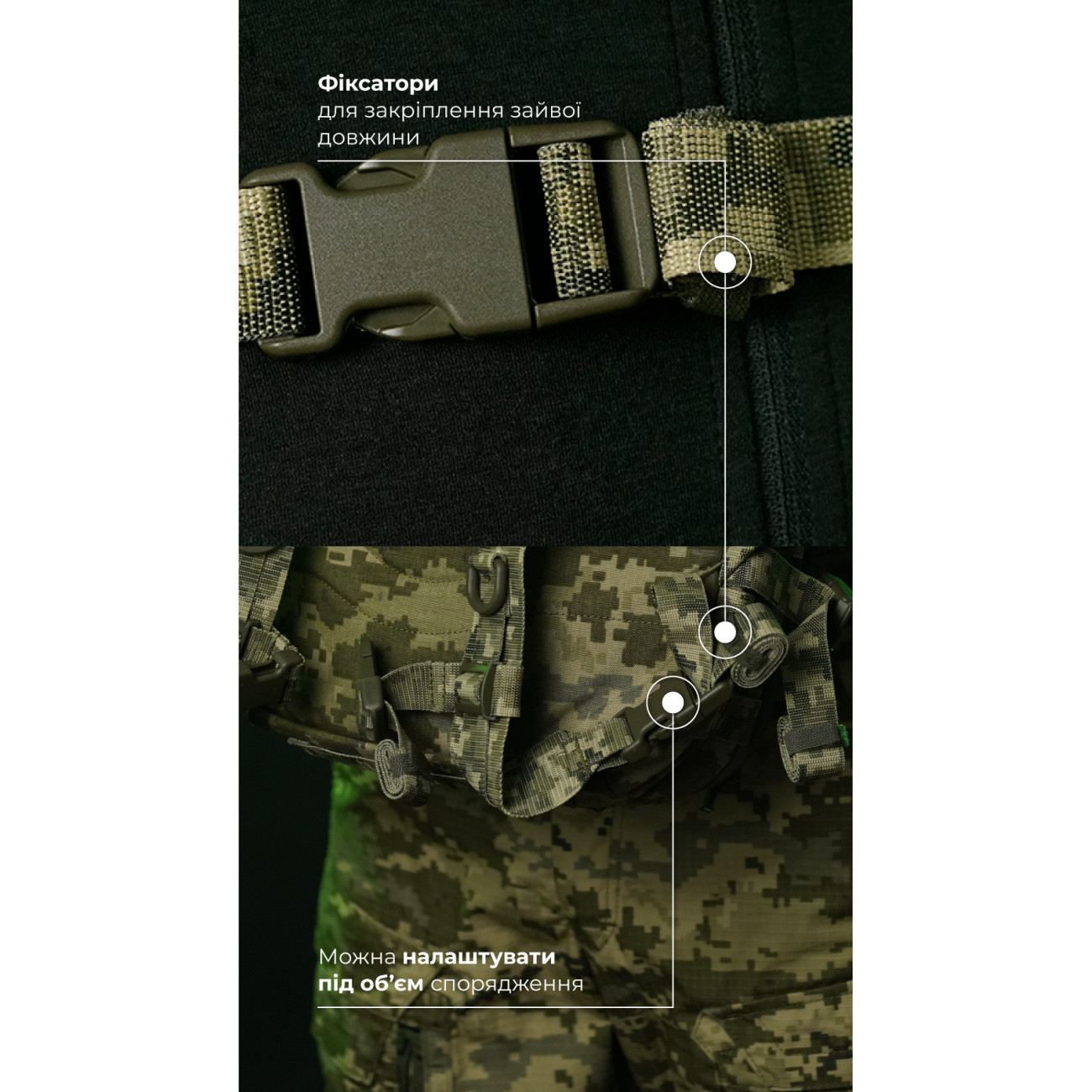 🔹 Плоскі лямки виконані з широкої стропи (5 см). Вони дозволяють зручно й ефективно вести вогонь, не знімаючи рюкзак з бронежилета. Довжину лямок можна регулювати, а зайву (до 50 см) – закріплювати велкро-хлястиками.