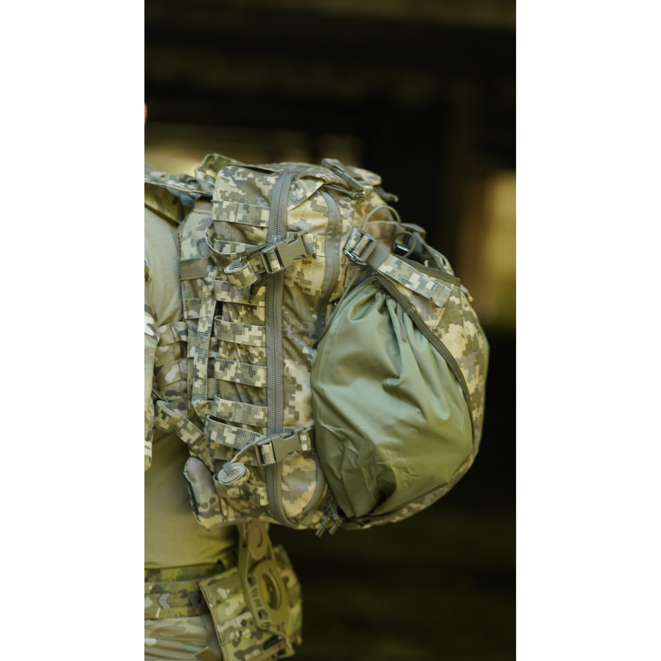 Підсумки для боєприпасів можна закріпити на велику велкро-панель у передньому відділенні. Підсумок для шолома фіксується до строп на фасаді за допомогою карабінів. Також за потреби ви можете встановити додаткові підсумки на зовнішню сторону рюкзака.
