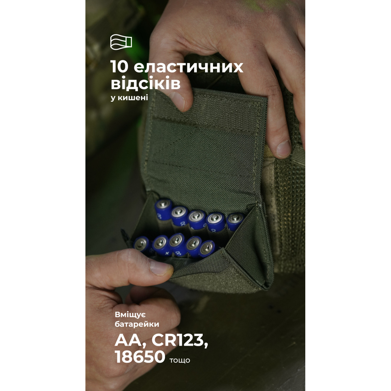 🔹 Всередині на обох стінках нашите еластичне кріплення з 10 відсіками. Кожен може вмістити батарейку типорозміру АА, CR123, 18650 або подібний вузький видовжений предмет до 8 см.