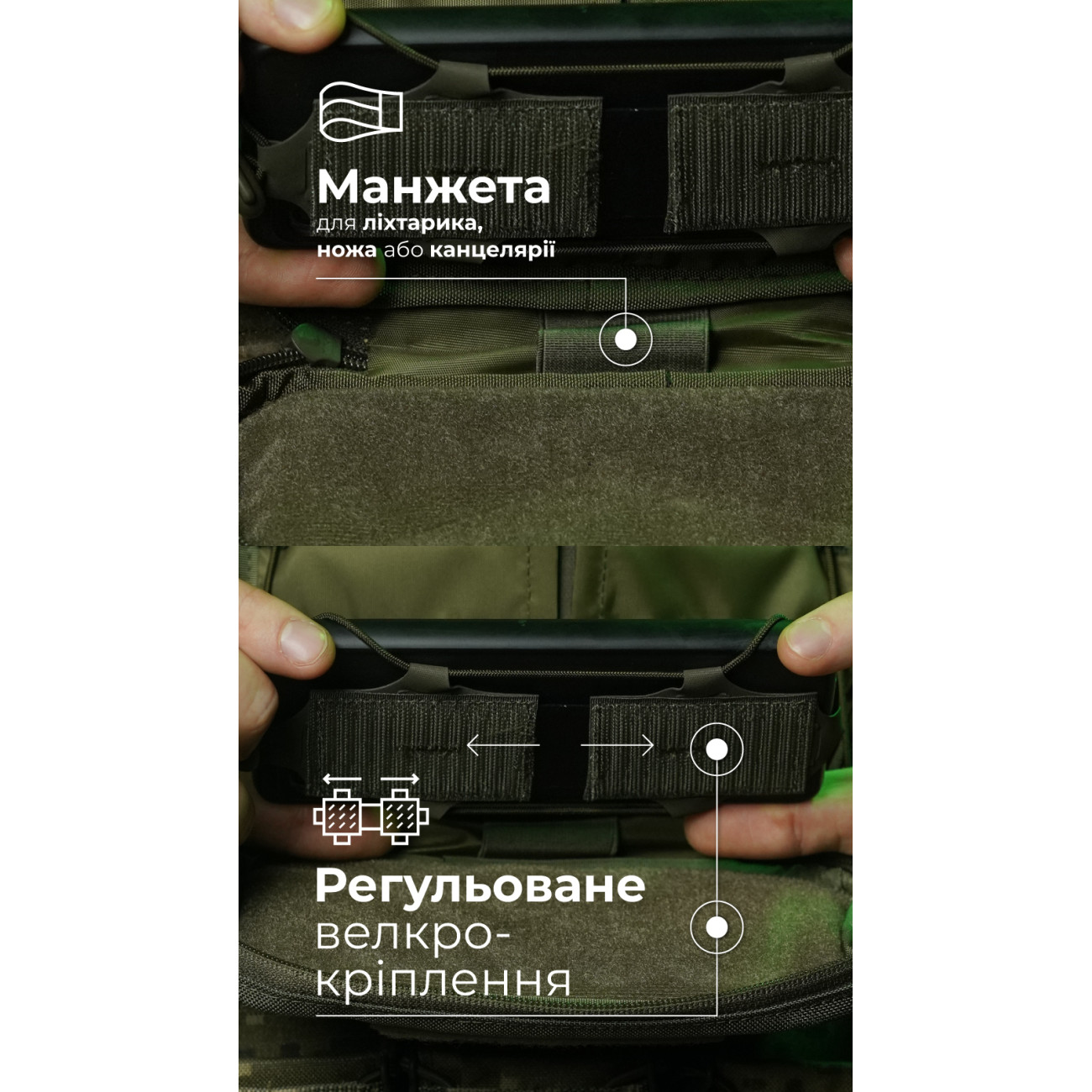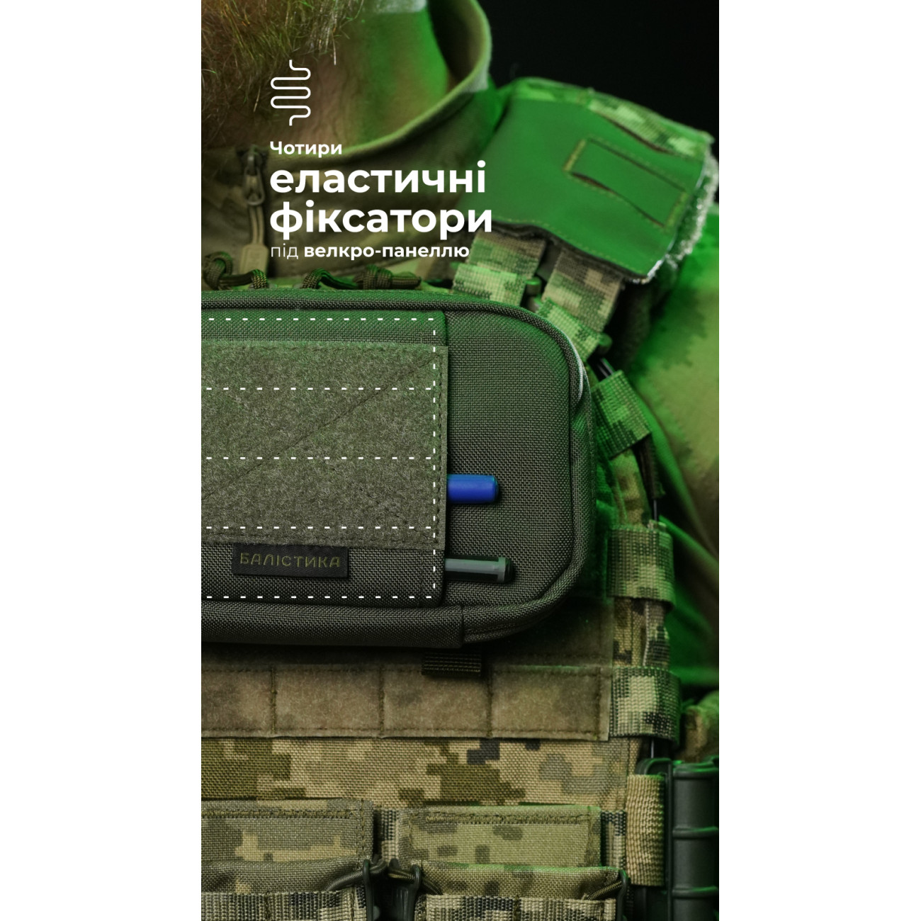 🔹 Під велкро-панеллю сховані чотири еластичні фіксатори, у яких можна тримати хімсвітло, маркери тощо.