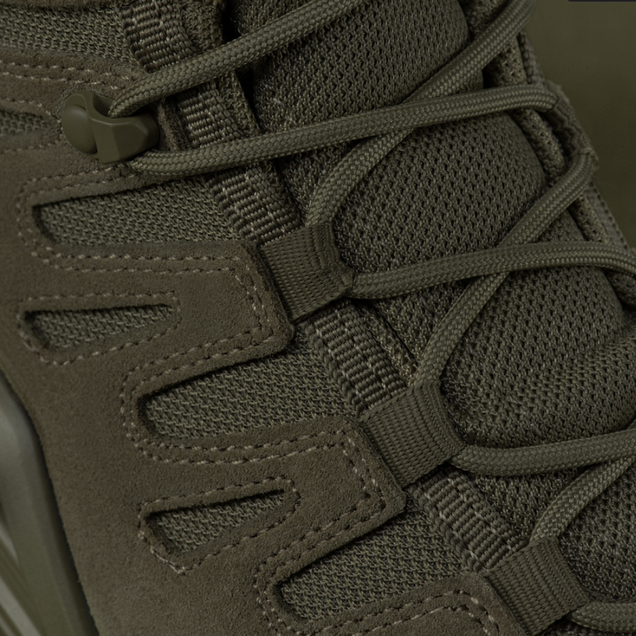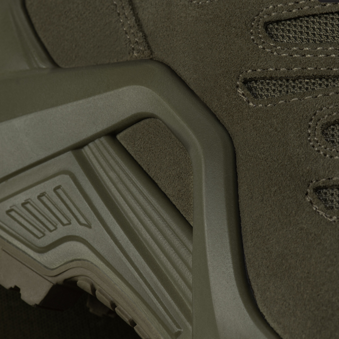 🔹Верх черевиків виготовлений із спліт-шкіри (натурального матеріалу, отриманого із нижнього шару шкіри) та нейлонової сітки з поліуретановим покриттям. У комбінації, ці матеріали утворюють зносостійкий, вологостійкий та повітропроникний шар, який є вкрай необхідними під час фізичних навантажень, трекінгу та руху по бездоріжжю.