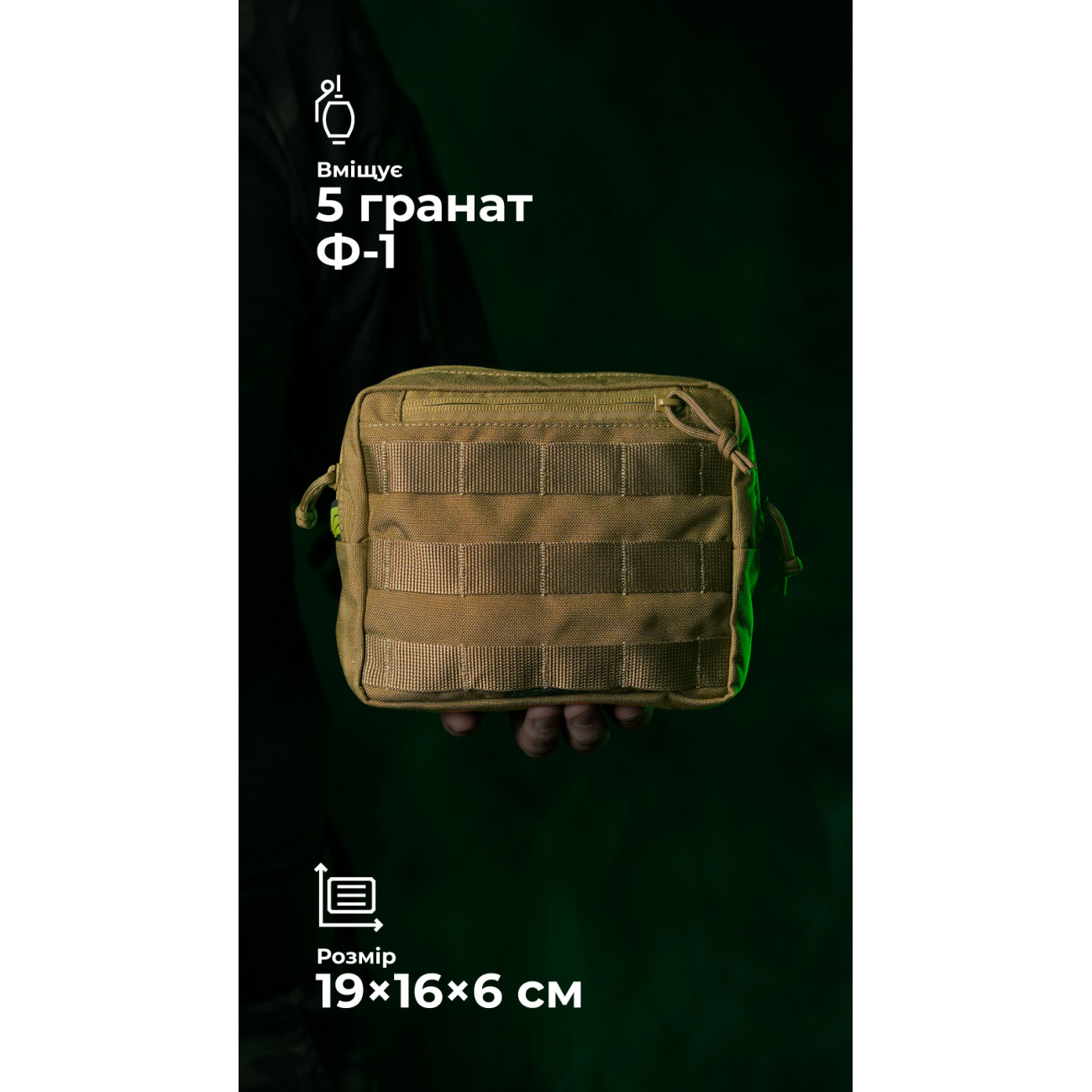 🔹 Крепится к снаряжению на 4 стропы молли, занимает ширину в 5 ячеек.