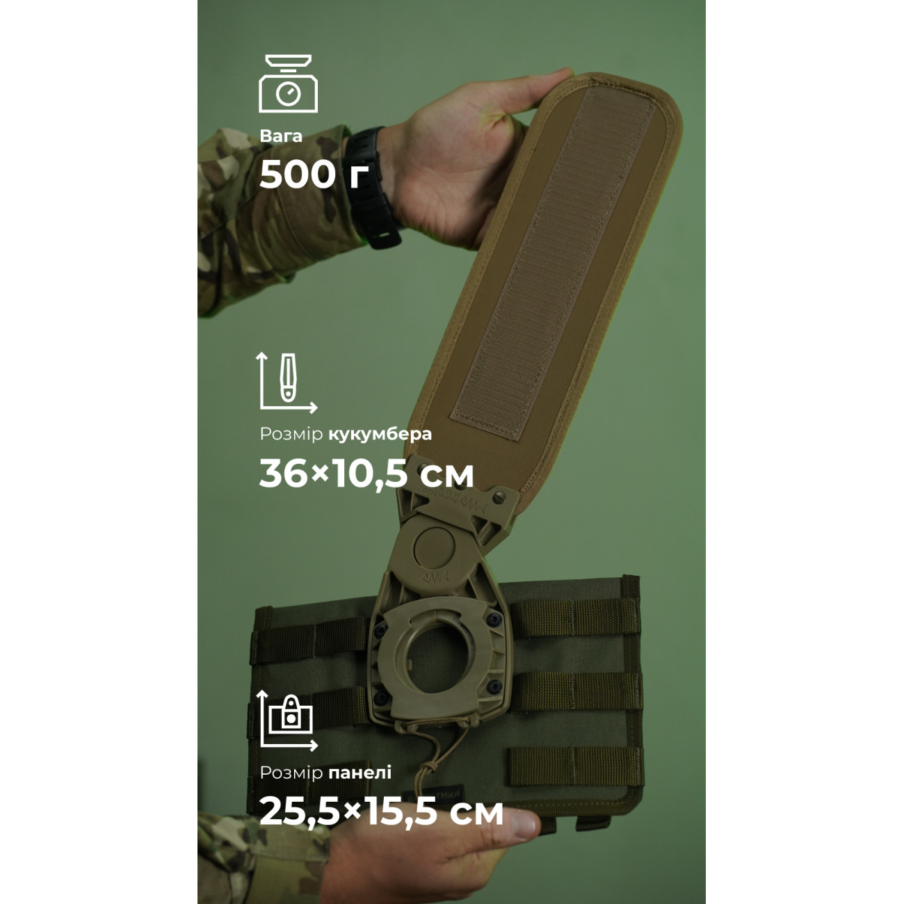 Кукумбер поднимает заднюю плиту бронежилета или плитоноски, а панель с TPP-пряжкой, пришнурованная к РПС, выступает как опора для кукумбера и берет на себя нагрузку.