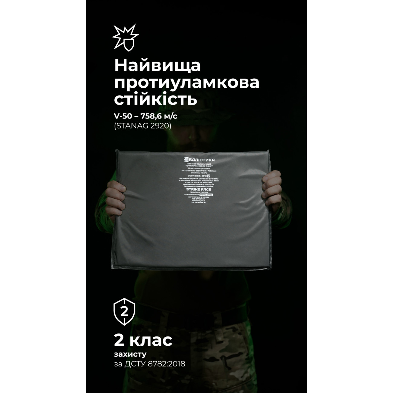 🔹 Бронепакет устойчив к поражению пулями 9×18 АПС и 9×19 Luger, что соответствует 2-му классу защиты по ДСТУ 8782:2018.