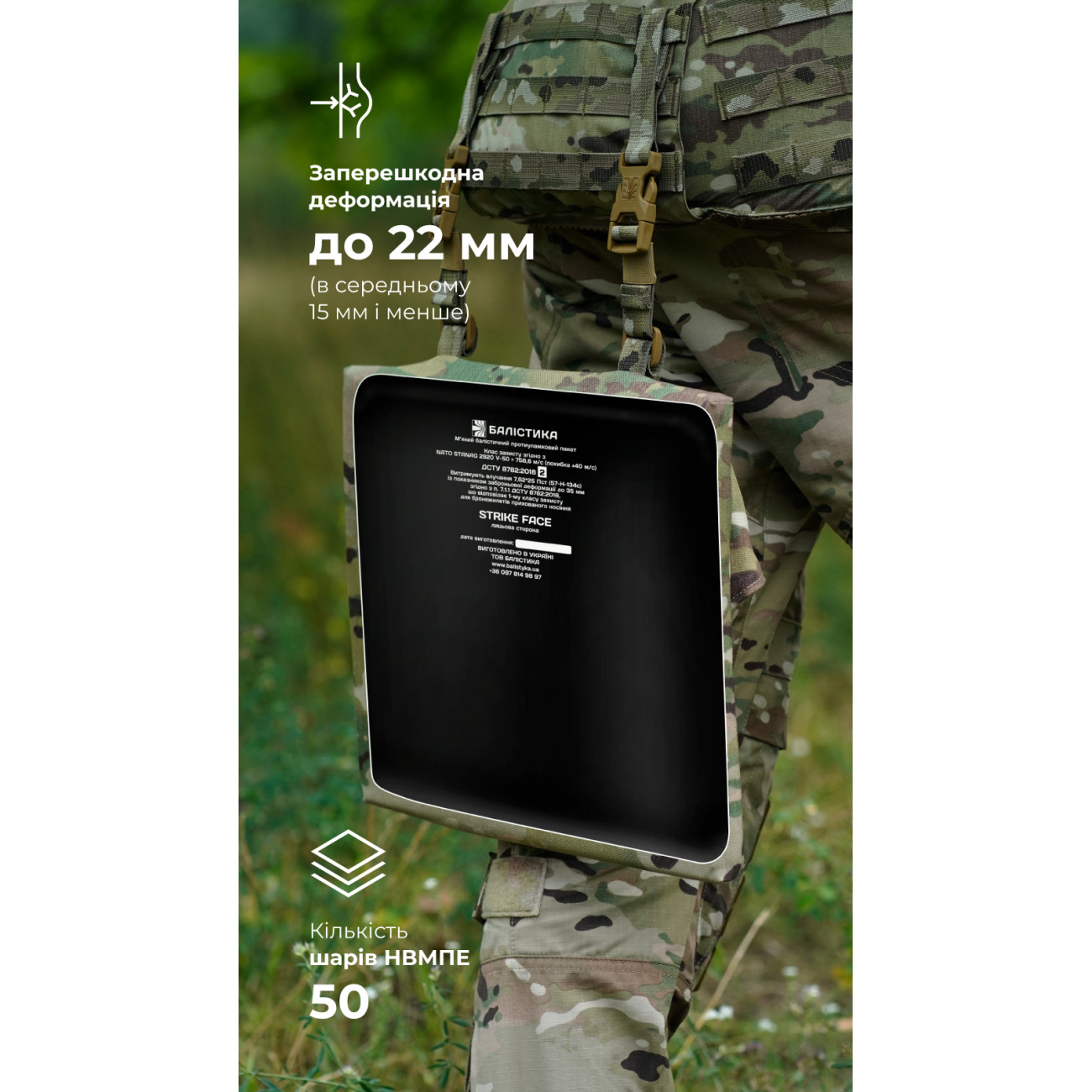 Наши бронепакеты созданы прежде всего для защиты от осколков, которые являются наиболее распространенной угрозой на фронте. Изделия имеют самые высокие показатели противоосколочной стойкости и результаты по показателю V50 (STANAG 2920, ДСТУ 8782:2018) в своем классе. Сверхвысокомолекулярный полиэтилен (СВМПЭ), из которого они изготовлены, является легким, гибким и одновременно очень прочным материалом.